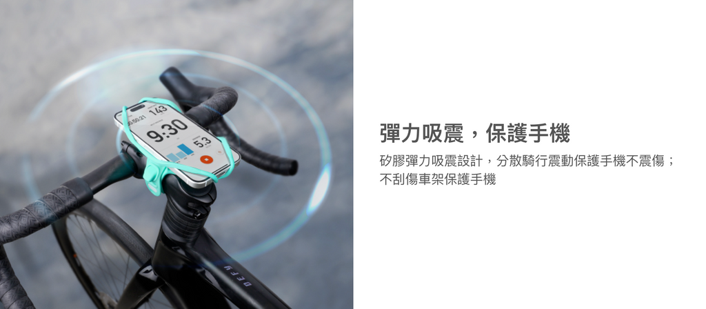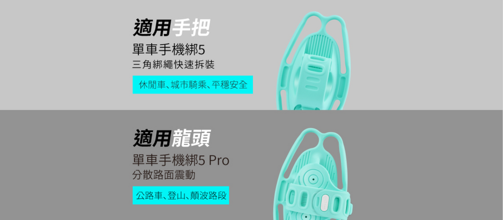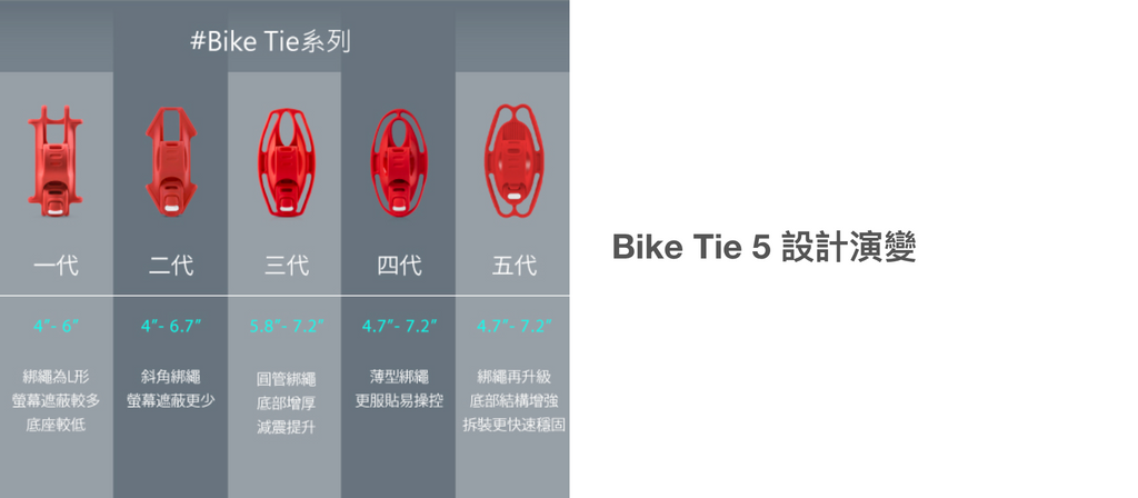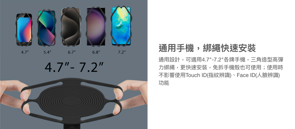 結構增強,彈性材質分散震動,保護手機 Bike Tie 5 - 綁帶緊密固定,不刮傷車把,適用不同把手管徑 通用綁繩設計,彈力吸震、保護手機,適用4.7吋到7.2吋手機 手機快速拆裝,不影響Face ID / Touch ID操作 環保矽膠材質,全件可水洗