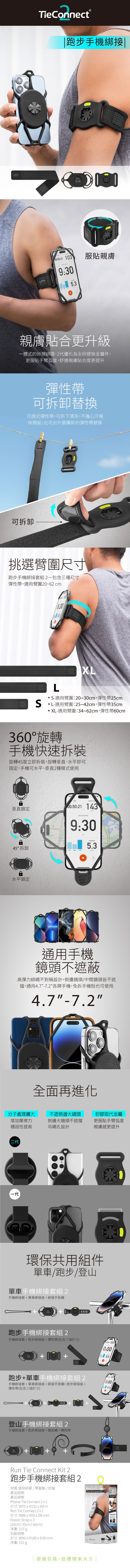 -軟、硬兩件式設計、彈性耐用,環保可拆解,易資源回收 -高拉力綁繩適用4.7吋到7.2吋各牌手機 -不對稱造型設計,通用『中置、側邊』鏡頭的手機 -手機可旋轉【水平、垂直】使用 -手機綁接套2兼容Garmin自行車錶之固定座 -跑步手機綁接套組,內含3個尺寸彈性帶,適用臂圍:18~62cm -彈性帶可單獨拆下清洗