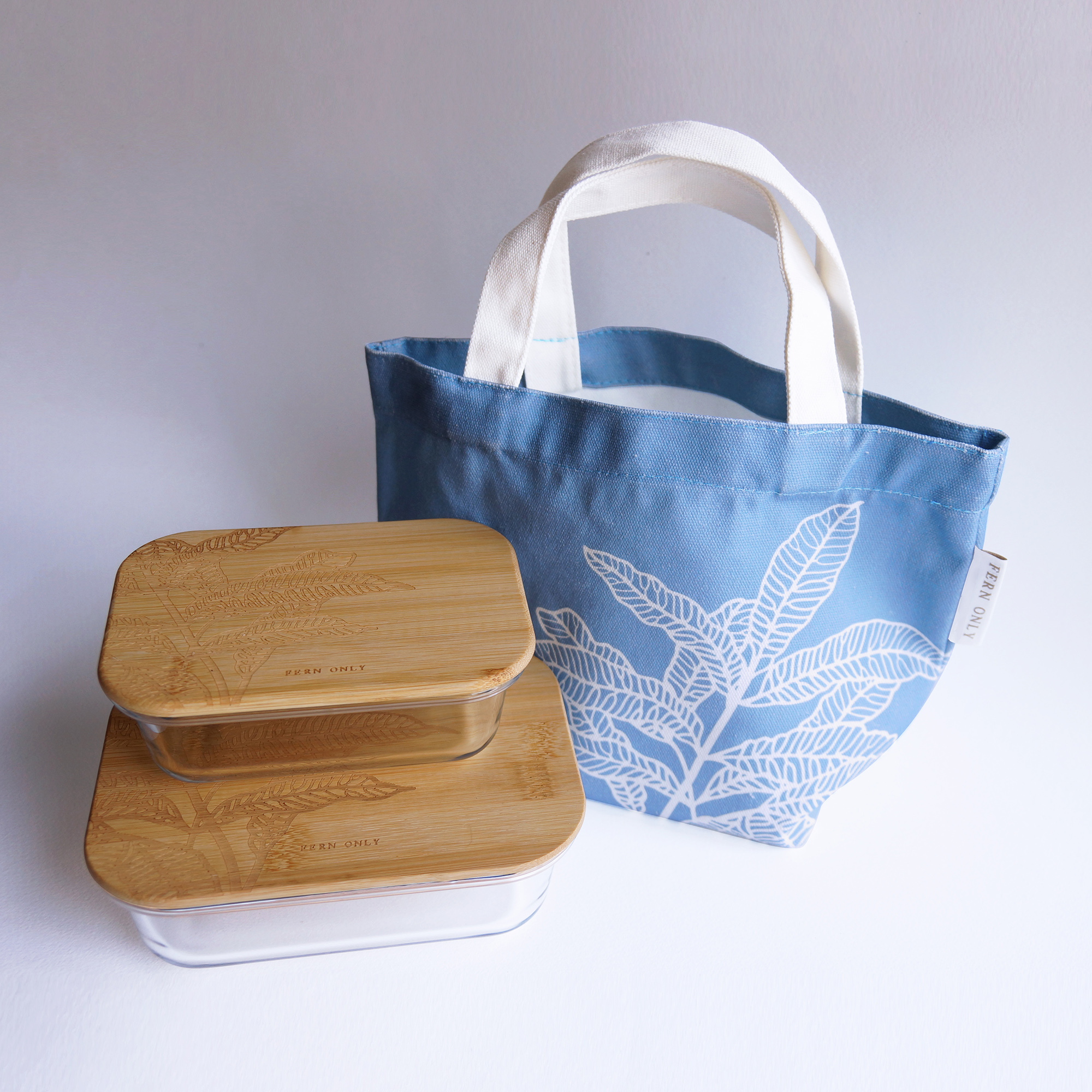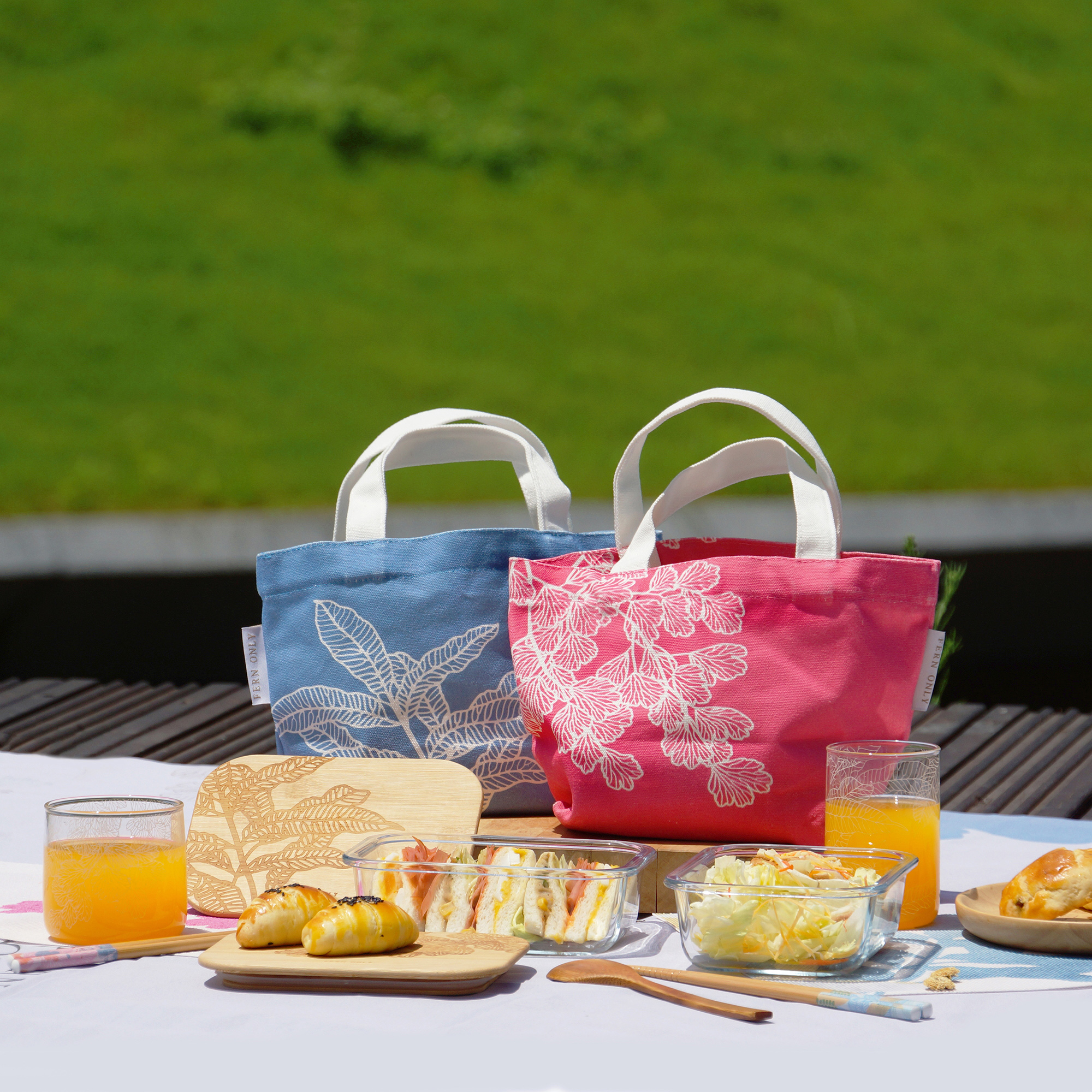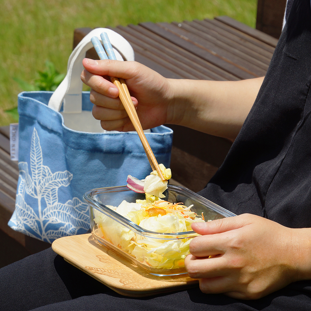 環保天然竹蓋+可微波加熱玻璃盒,一次兩款容量便當盒,不管主食或水果皆可一次傳便便;還有專屬棉質便當袋,上班、遠足或野餐,一袋OK!