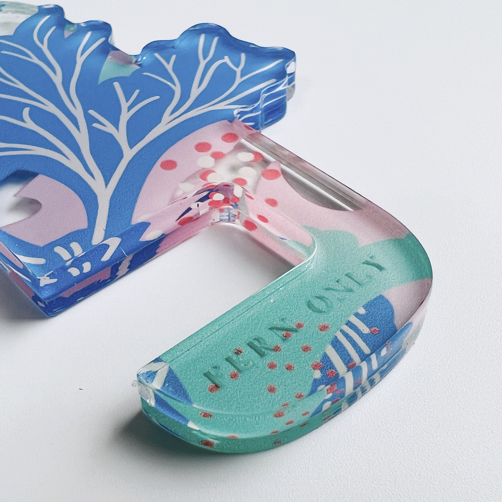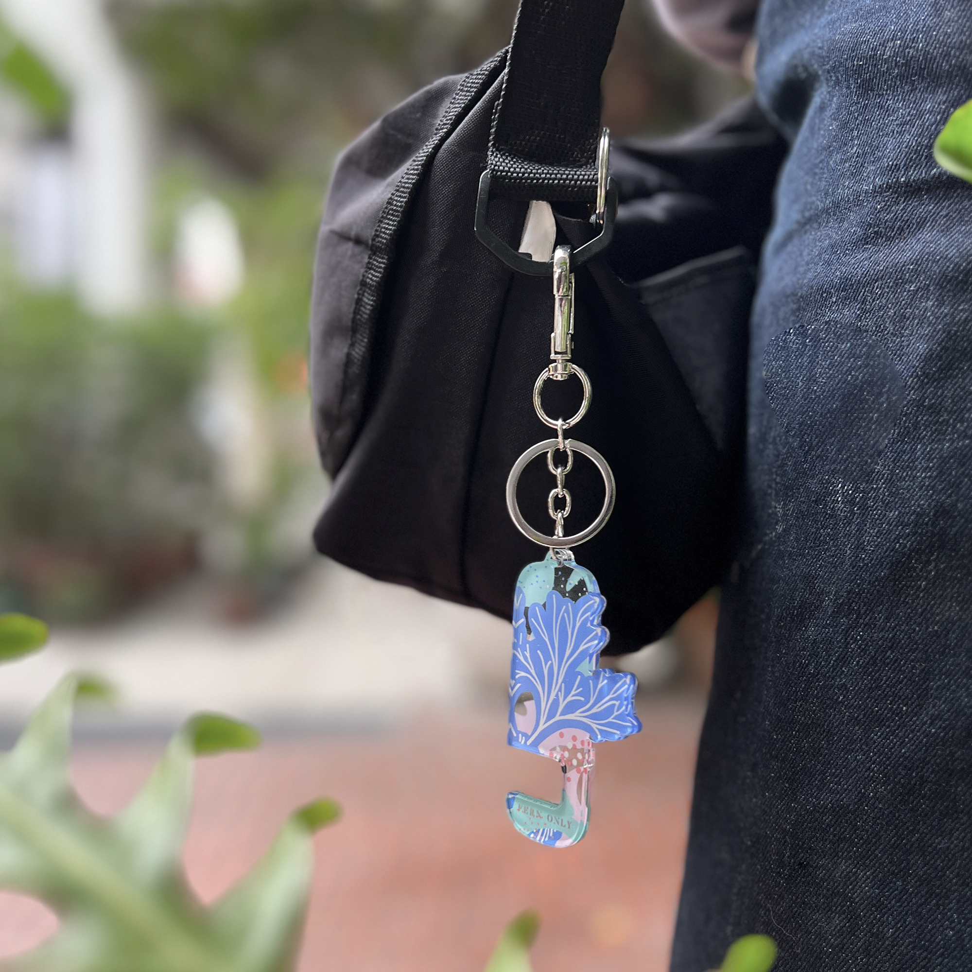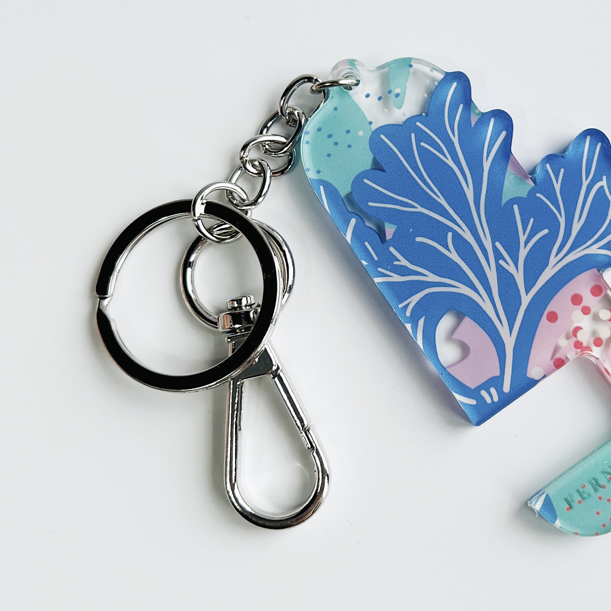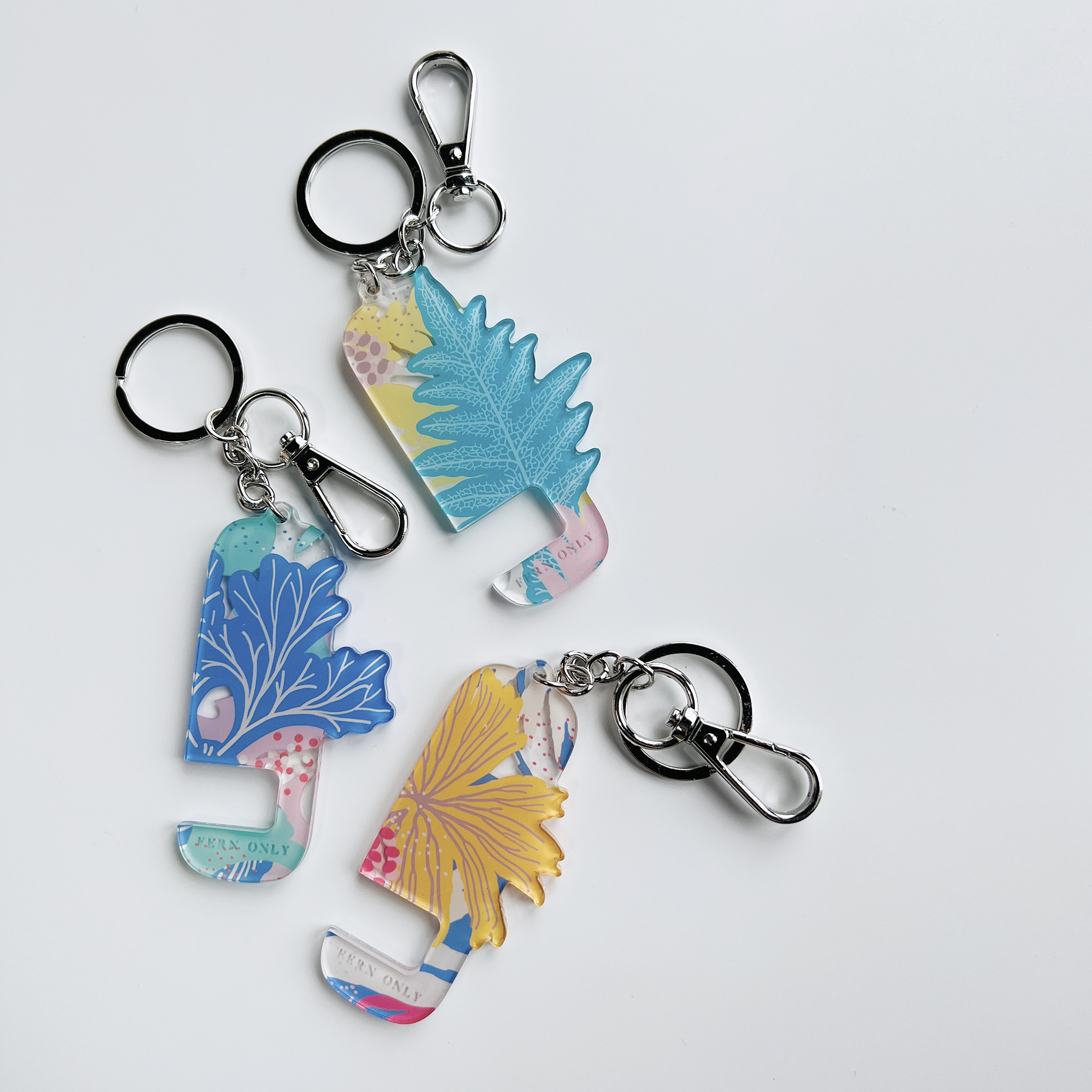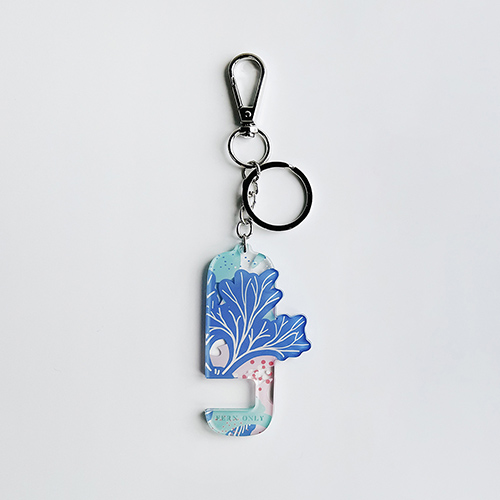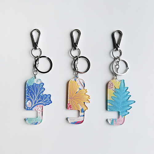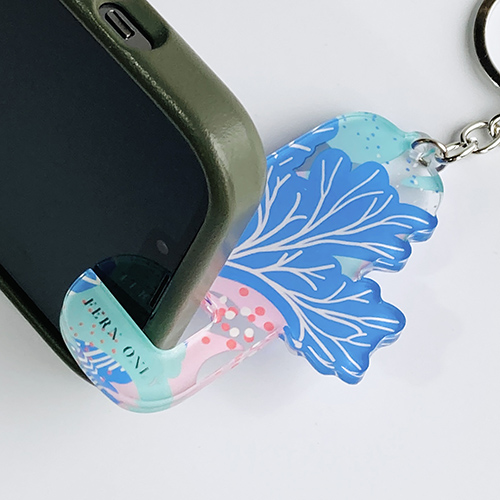 用壓克力裁切出蕨類的姿態,用壓克力刻印出柔和的色彩,用小小的鑰匙圈變身成用途大大的手機架! 追劇、視訊輕鬆架著走!