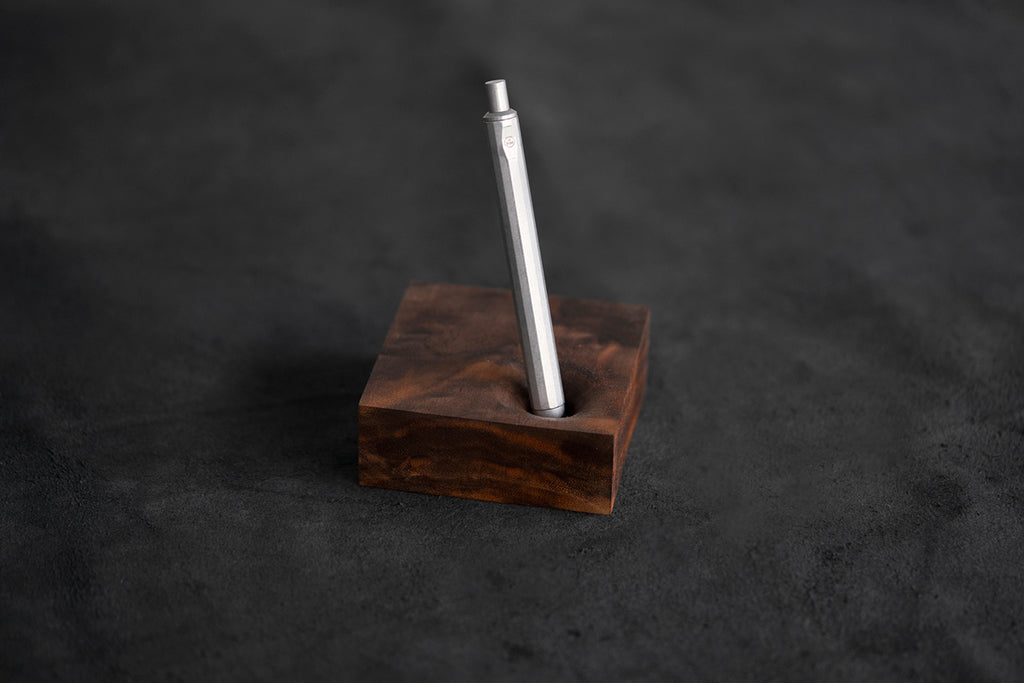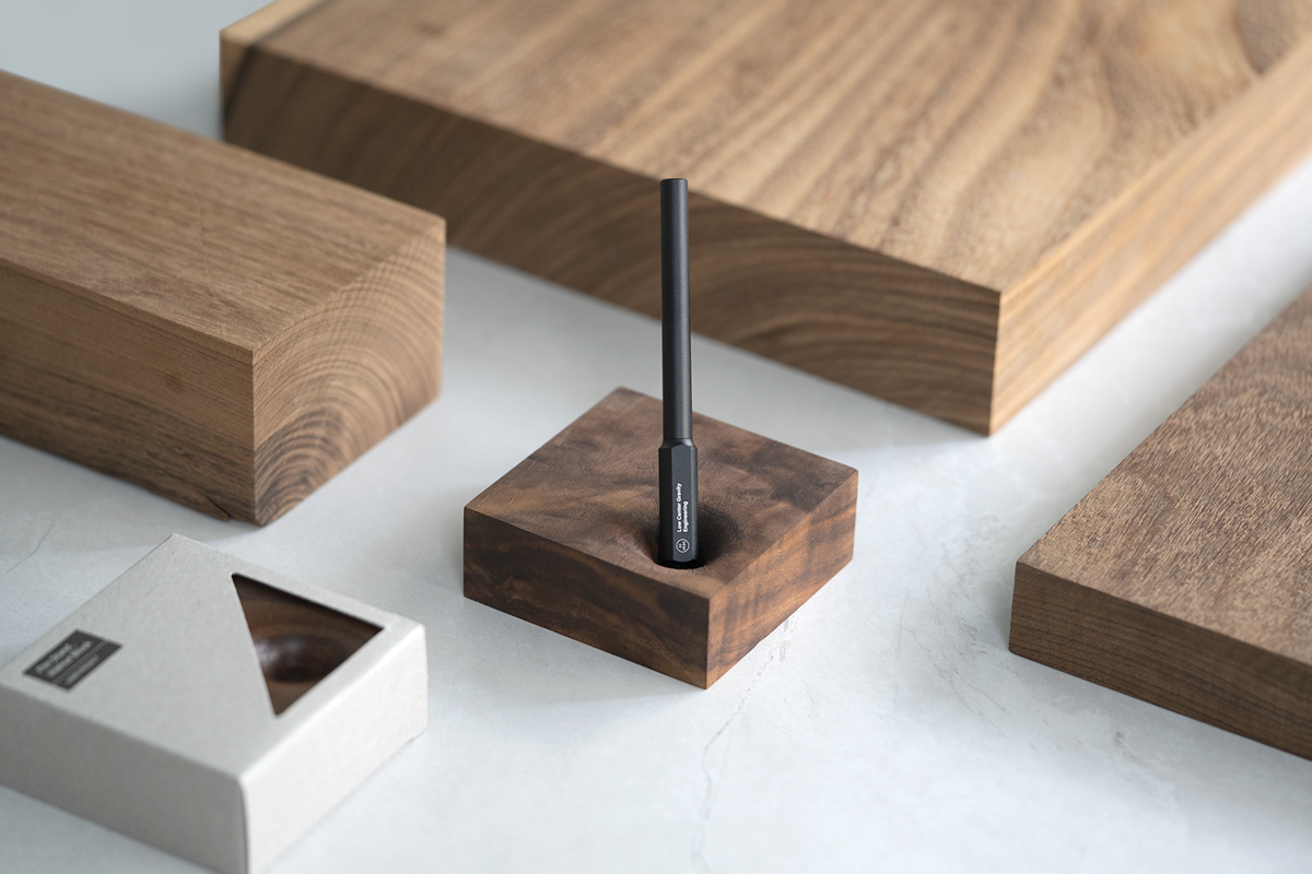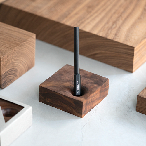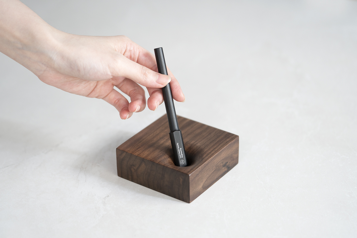 木質底座以85mm X85mm的胡桃木塊為基底,以特殊角度琢磨出圓弧筆座孔洞,即使隨意擺放,細長的筆身也可自然旋入孔洞,以優雅斜度安放,木筆座為居家生活與辦公環境增添氣氛。
