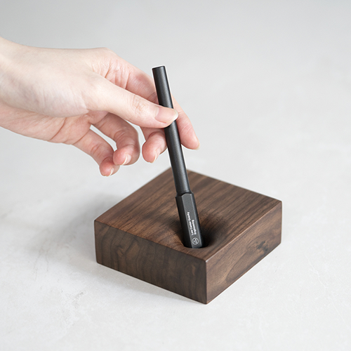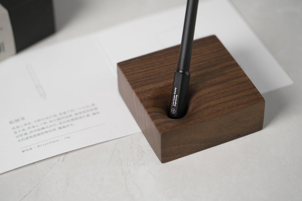 鉛錘筆 Plummet Ballpoint ・材質:全鋁材質 ・尺寸:Ø11*116mm ・重量:18.8g ・筆芯規格:SCHMIDT Refill P900M(約為0.7mm) ・筆芯顏色:黑 ・台灣製造 木質底座 Walnut Block ・材質:胡桃木 ・尺寸:85*85*32mm ・重量:178g ・台灣製造