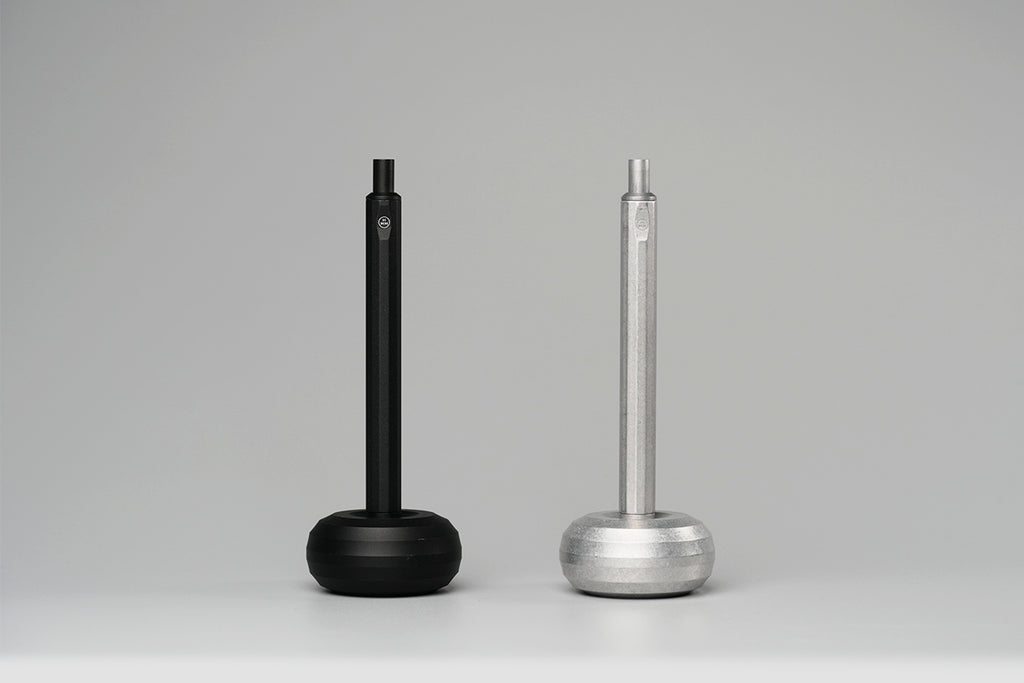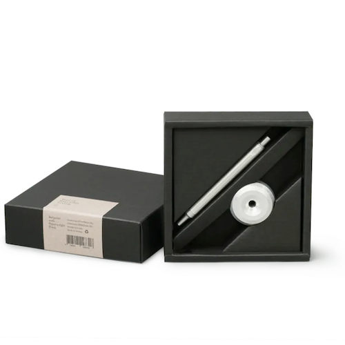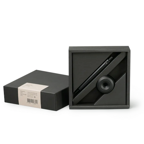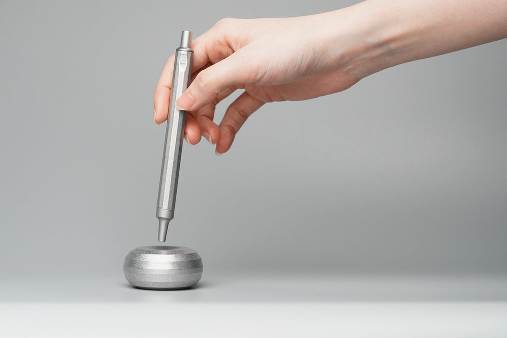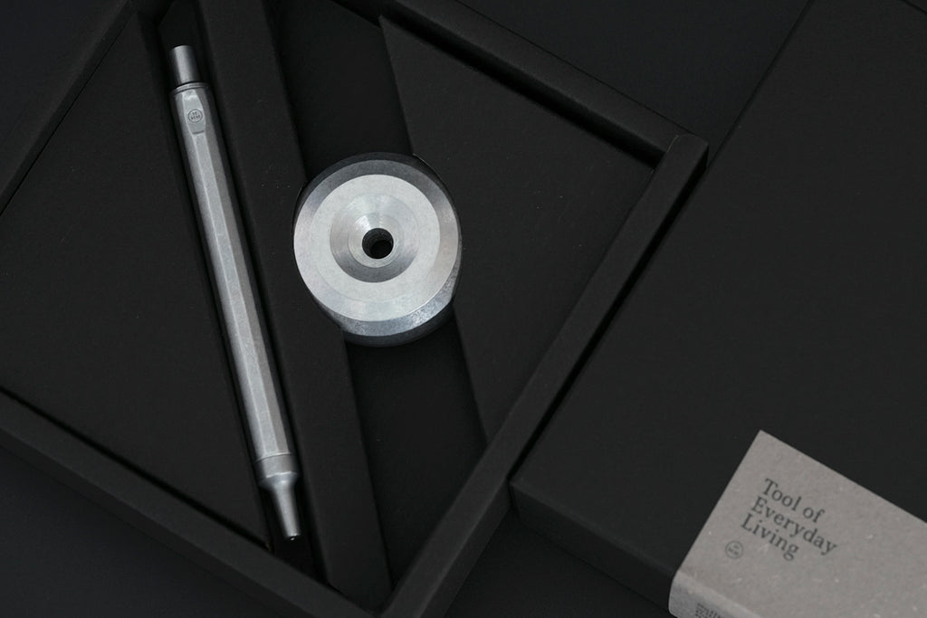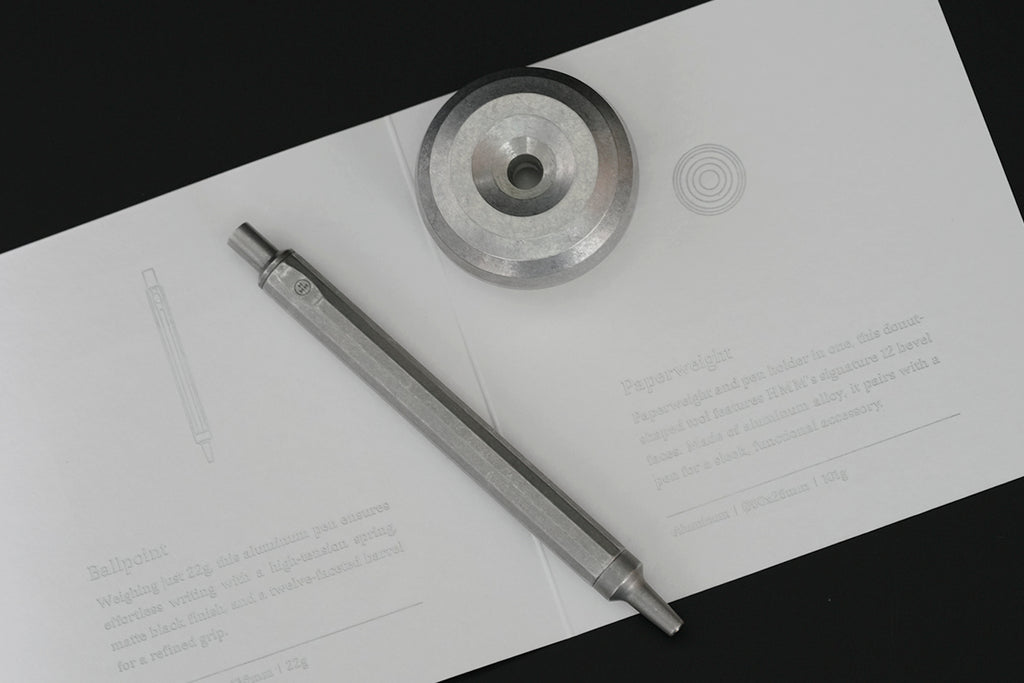 精準命中 工作人的極簡俐落 HMM鋁質書寫禮盒是為金屬質感愛好者打造的書寫組合。直徑五公分的鏤空圓型筆座,份量感是剛剛好的101公克,使用時穩住筆身,動腦捕捉靈感時,單手把玩,不易沾染指紋。內側延續角面切割,精準貼合HMM經典十二角面原子筆,亦適用於HMM自動鉛筆及市面大部分筆款。 如日晷立於工作桌面 效率與浪漫同時擁有 每一次書寫都是命中紅心的精準傳達,猶如HMM原子筆與圓形筆座的完美契合。90度立於桌面,隨時取用;用畢歸位,筆身自動平衡置中,從容有序。 經典1+1 鐵粉最愛一起買 HMM 原子筆 Ballpoint 由全鋁材質打造,僅有 22g 的重量,筆身平穩配重,運筆輕盈舒適,適合長時間書寫。出廠時內建德製筆芯 SCHMIDT Refill P900M派克型原子筆芯,通用規格,容易補給。讓好寫的筆,可以陪你更久。紙鎮 Paperweight 整體採用全鋁合金實心精密切削,手感沈穩紮實。 鋁原色新組合 原始材質的粗獷魅力 鋁原色原子筆是HMM熱銷筆款,鐵粉長期敲碗鋁原色筆座,完整裸色美學。筆身與筆座保留赤裸的全鋁材質感受,粗獷原始,裸材手感。比起完美無瑕的陽極霧黑,鋁原色自帶一批擁護者,深受崇尚霧銀風格的工藝玩家喜愛。筆身觸感潤澤優雅,低調不失率性。 職場送禮推薦 獻給最瀟灑的那位 HMM書寫禮盒系列自推出以來便是送禮熱門之選,內含木質底座的質感書寫禮盒適合送給大器有成的前輩,原子筆與皮質筆套的隨身書寫禮盒則適合移動辦公的族群;鋁質書寫禮盒線條更加俐落簡約,適合在乎細節和諧、瀟灑洗練的品味家。放在工作桌或櫃檯,讓隨手筆記更從容。霧面金屬色好搭配,陽極黑適合All in Black的酷酷集團,鋁色金屬筆則接近霧銀色,適合裸色工業風的工作環境。 使用方式與保養秘訣 墨水用盡或想換色時,只需將筆尖朝上,逆時針旋轉筆頭,即可更換筆芯。出廠時內建德製筆芯 SCHMIDT Refill P900M,「派克型原子筆芯」是一種通用規格,市售筆芯亦找的到水性規格可供替換。筆身表面雖經陽極處理,仍建議盡量保持乾燥。若不慎沾水,快速擦拭表面即可。從握筆處輕輕旋開,即可輕鬆換色。表面雖經陽極處理,仍建議盡量保持乾燥。若不慎沾水,快速擦拭表面即可。
