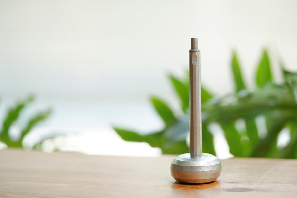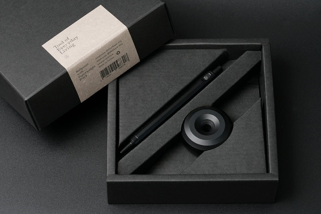 原子筆 Ballpoint 材質:鋁,陽極處理 尺寸:Ø11*136mm 重量:22g 筆芯規格:SCHMIDT Refill P900M(約為0.7mm) 產地:台灣 紙鎮 Paperweight 材質:全鋁材質 尺寸:Ø50mm*25mm 重量:101g 產地:台灣