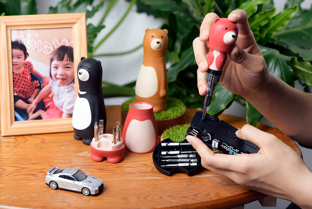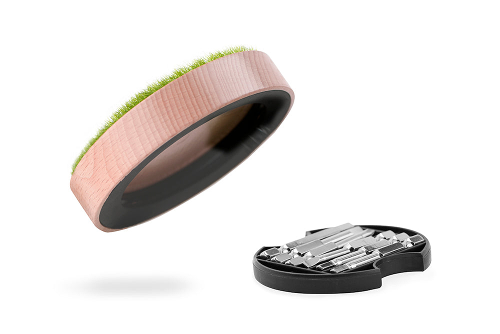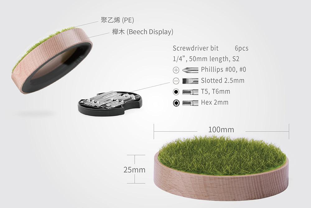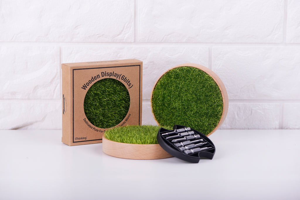原木設計加上仿真草地材質,可當杯墊或是放上公仔、飾品、喜愛的東西都很適合。 翻開底部更是別有洞天,加附不同規格小起子頭X6,手錶、眼鏡、遙控器…等小螺絲都沒有問題,讓木頭展示座不再是展示座,更是生活上的好幫手。