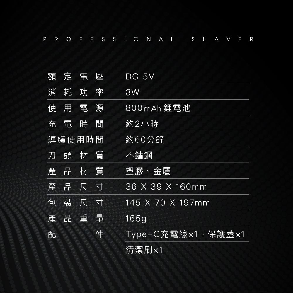 額定電壓:DC 5V 消耗功率:3W 使用電源:800mah鋰電池 充電時間:約2小時 連續使用時間:約60分鐘 刀頭材質:不鏽鋼 產品材質:塑膠、金屬 配件:Type-C充電線x1、保護蓋x1、清潔刷x1 產品尺寸: W36xH160xD39 mm 產品重量: 165 g 包裝尺寸: W145xH70xD197 mm 授權碼V20123101