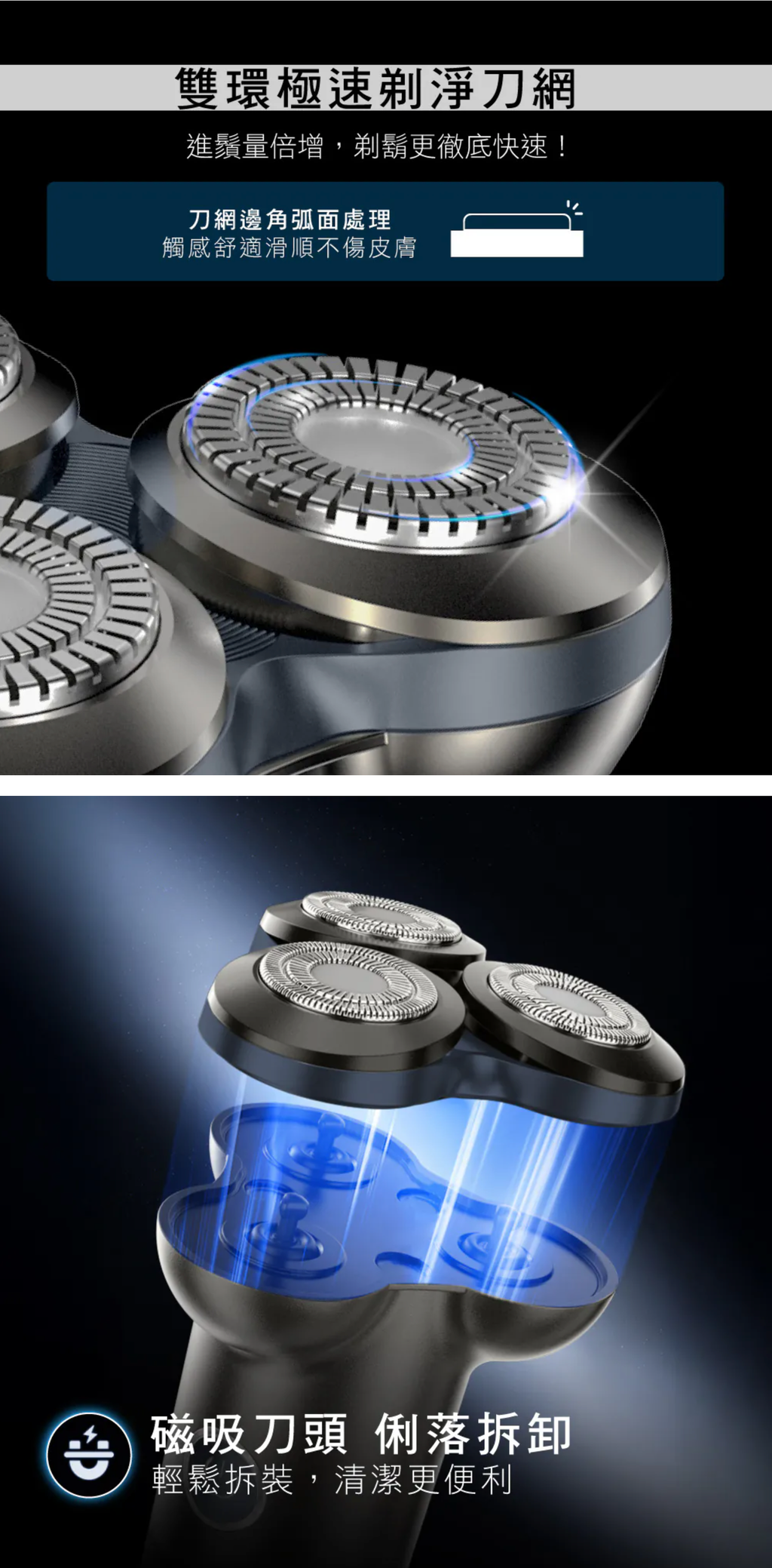 3D立體浮動刀頭 貼合臉部曲線,滑順剃淨不殘留 磁吸刀頭設計 分離式機身,拆裝清潔更便利 雙環極速刀網 進鬍量倍增,雙倍鋒利高效,潔淨再升級! 9500rpm高效能馬達 強勁動力,迅速剃鬍不卡毛 充插兩用?1.5小時快充 Type-C隨插即用,快速補電 60分鐘長效續航 隨身攜帶,旅行使用更安心 貼心低電量提示燈 電量不足,智能即時提醒 IPX6高壓水洗 輕鬆水洗更潔淨 時尚消光質感 俐落設計,展現尊榮品味 保固說明: 非人為因素之損壞,原廠保固一年。 使用前請確實遵從產品說明書內之操作指示及注意事項。 如需辦理退換貨,包裝與配件須完整(商品配件、包裝完整,無刮痕損傷)。 產地:中國