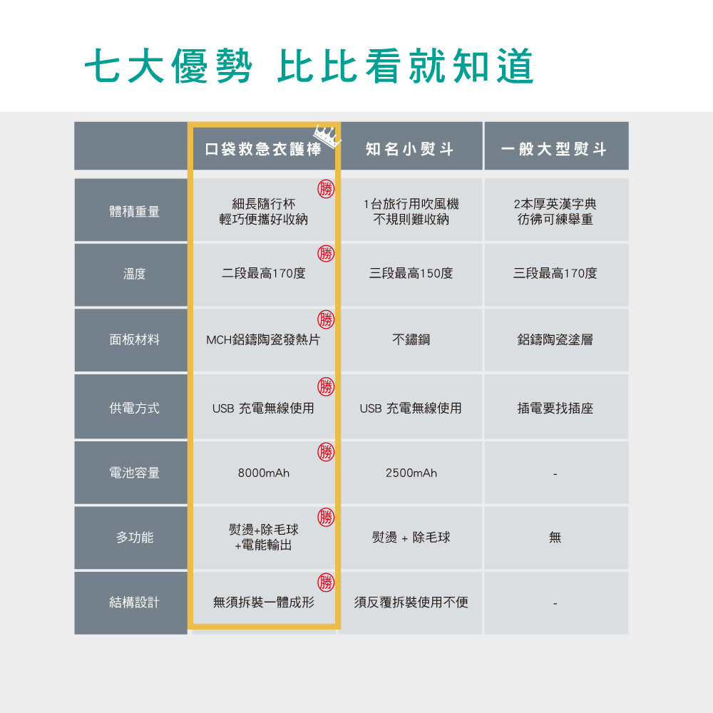 全機 400g,像隨行杯一樣好拿好帶好收納 一體成形,一手翻轉,想要的功能即刻到位 一秒速熱,專業級 MCH 高溫陶瓷發熱片 兩檔溫度 120 °/170 ° 拒絕溫感、秒平皺褶 高效率除毛球,6,500RPM 高轉速俐落乾淨 TYPE-C USB 規格全球通用,熨衣免找插座 8,000mAh 大容量電池,可為手機供應電能 搭載 NTC 感溫探頭,過熱自動斷電保護安全