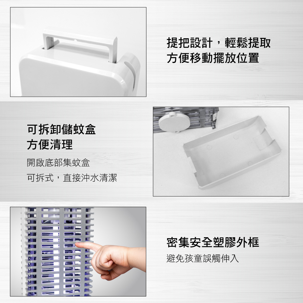 吸入+電擊 利用蚊蟲隨風而行的特性,加上雙風扇超強吸入氣旋,引導蚊蟲進入捕捉範圍,一網打盡。 強力電擊,密集高壓電網,無死角捕殺蚊蟲。 有效誘蚊 捕蚊光波365nm:採用特殊耐用紫外線燈管,長壽長效,誘蚊時效長。 擺放時,捕蚊燈建議離地面高度約75-100公分,效果更好。 安全保障 採用對人體無害的UVA紫外線燈管,使用更放心。 物理誘捕技術,無毒、無味。 全機採用ABS防阻燃材質,使用安全、堅固耐用。 無電擊危險。 通過國家最新安全規格檢驗合格商品。 遠離登革熱,守護健康。 外觀設計 新穎造型,時尚設計。 可拆卸儲蚊盒,方便清理蚊蟲。 密集安全塑膠外框,避免孩童誤觸伸入。 提把設計,輕鬆提取,方便移動至家中任何角落擺放。