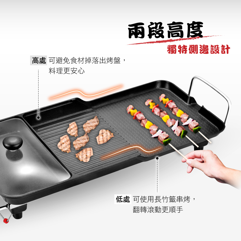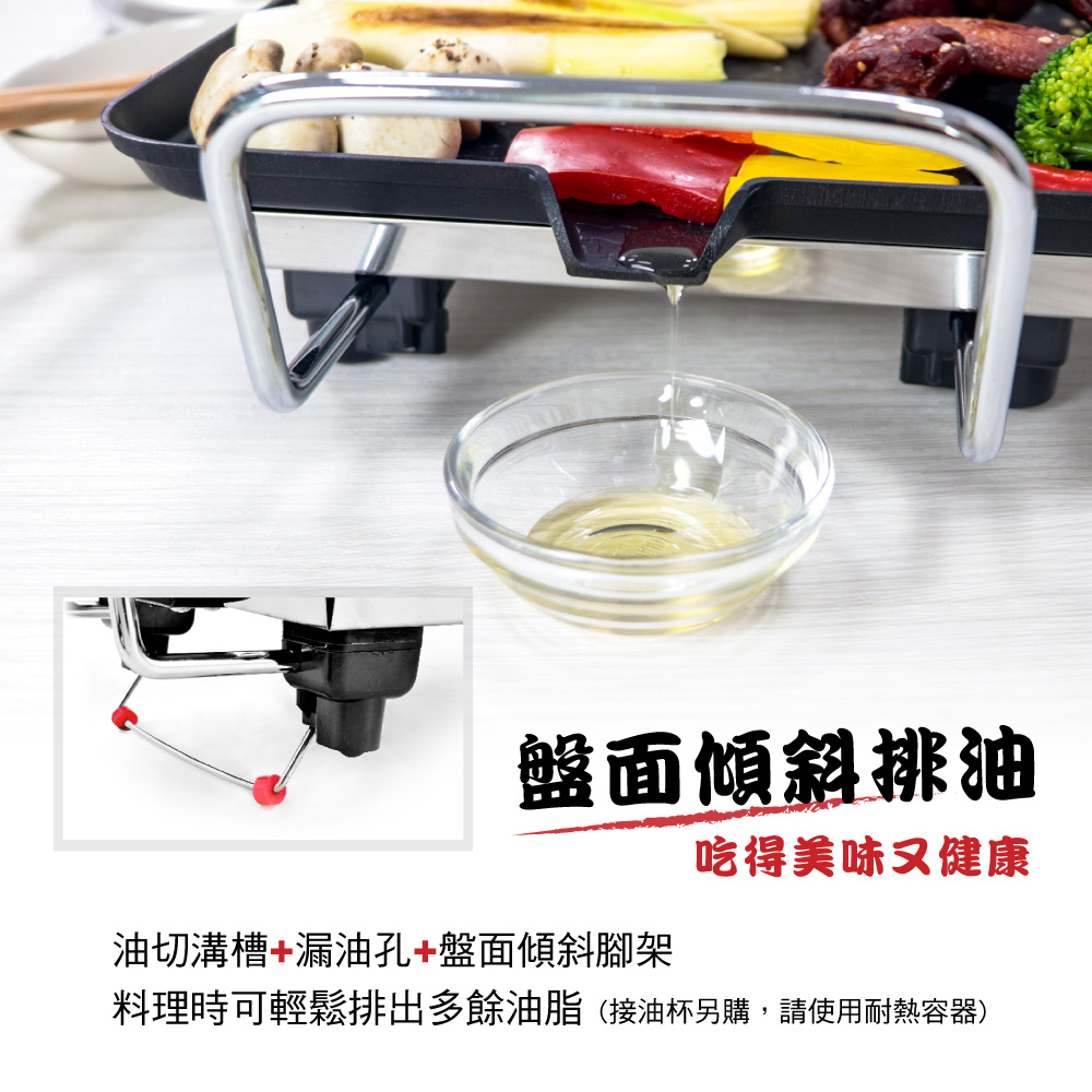 SGS檢驗合格無塑化劑,無重金屬。 超大面積烤盤+薄型機身設計,家庭聚餐首選,可同時進行多種料理。 油切溝槽、漏油孔、盤面傾斜腳架設計,料理時可輕鬆排出多餘油脂,少油無煙更健康。 烤盤平面處方便同時料理海鮮、麵食等美味料理。 五段火力,最高240度C高溫,根據不同料理自由選擇。 烤盤不沾塗層,清洗方便,通過LFGB/FDA雙重食品級認證,安心使用。 分離式溫控器,安全收納方便。 底部大面積加熱管,無煙燒烤,加熱快速均勻。 附玻璃上蓋,料理方式更多元。 安全防護設計,防乾燒過熱斷電保護、防火阻燃材質。