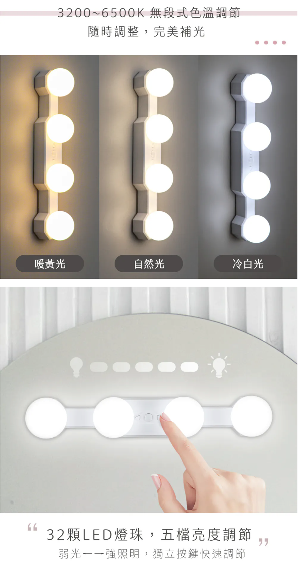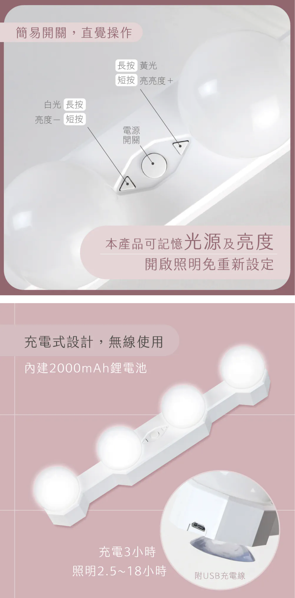 吸盤吸附/無痕背膠黏貼,多種固定方式,使用場景不受限 仿燈泡造型LED燈設計,5檔記憶亮度調整,滿足環境光源補光需求 暖黃/冷白雙光源無段式調節,溫和不傷眼,適合更多照明需求 充電式設計無線使用,內建2000mAh電池,續航2.5~18小時 保固說明: 非人為因素之損壞,原廠保固一年。 使用前請確實遵從產品說明書內之操作指示及注意事項。 如需辦理退換貨,包裝與配件須完整(商品配件、包裝完整,無刮痕損傷)。 產地:中國