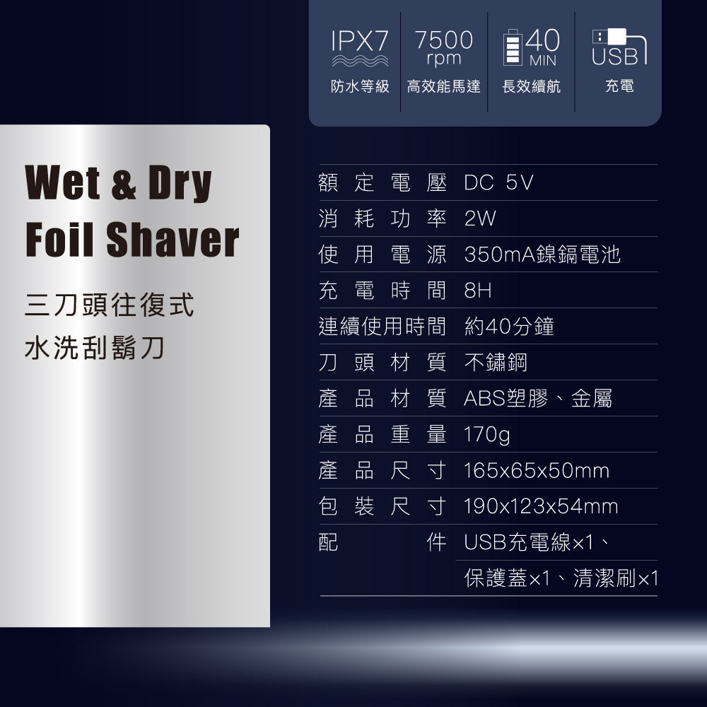 超大網面往復式刀頭,快速剃鬍,效率滿點。 獨立浮動三刀頭,貼合不同臉型,乾淨不留鬍渣。 7500rpm高效能馬達,刮鬍俐落不扯毛。 IPX7防水等級,刀頭可分離水洗,清潔更便利。 機身彈出式鬢角刀,修剪便利,立刻有型。 單鍵操作,簡易上手。 LED提示燈,運作/電量狀態一目了然。 USB充電式設計,隨處充電好便利。