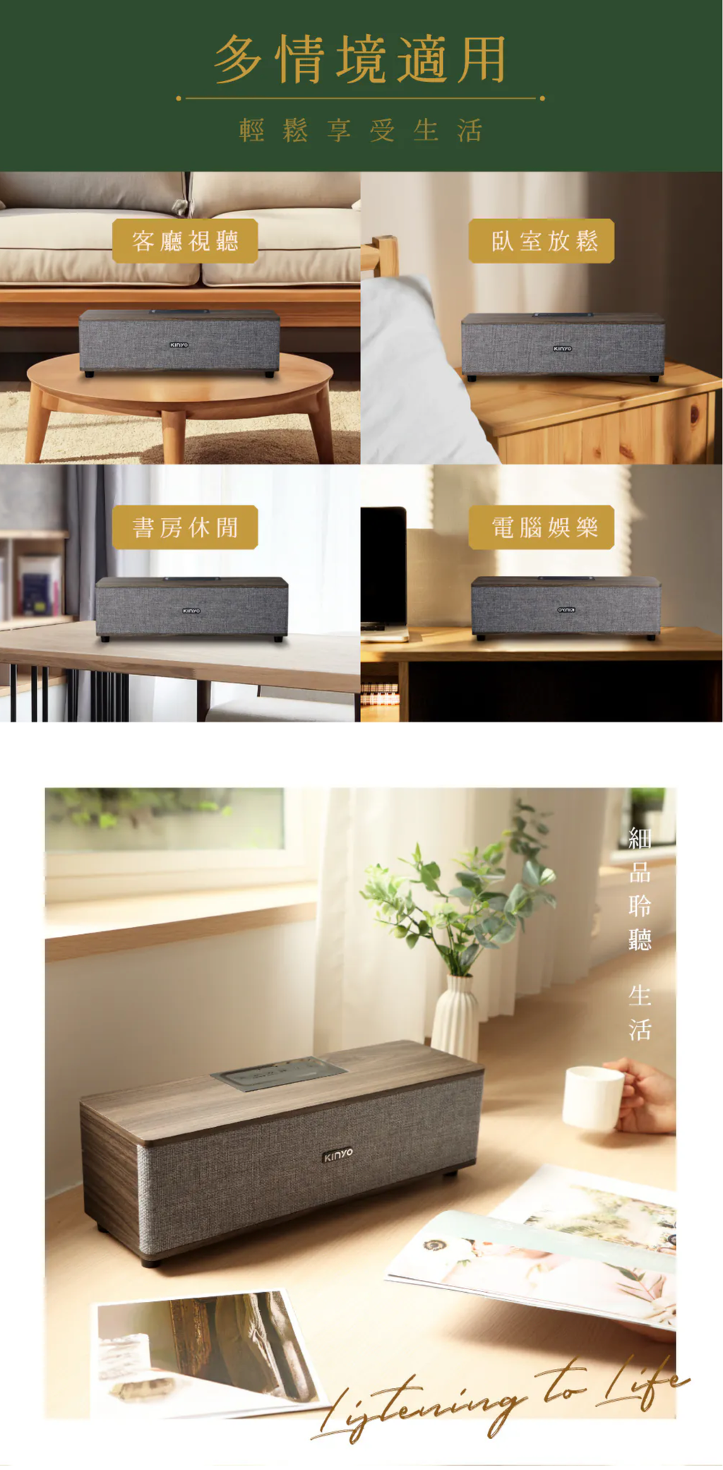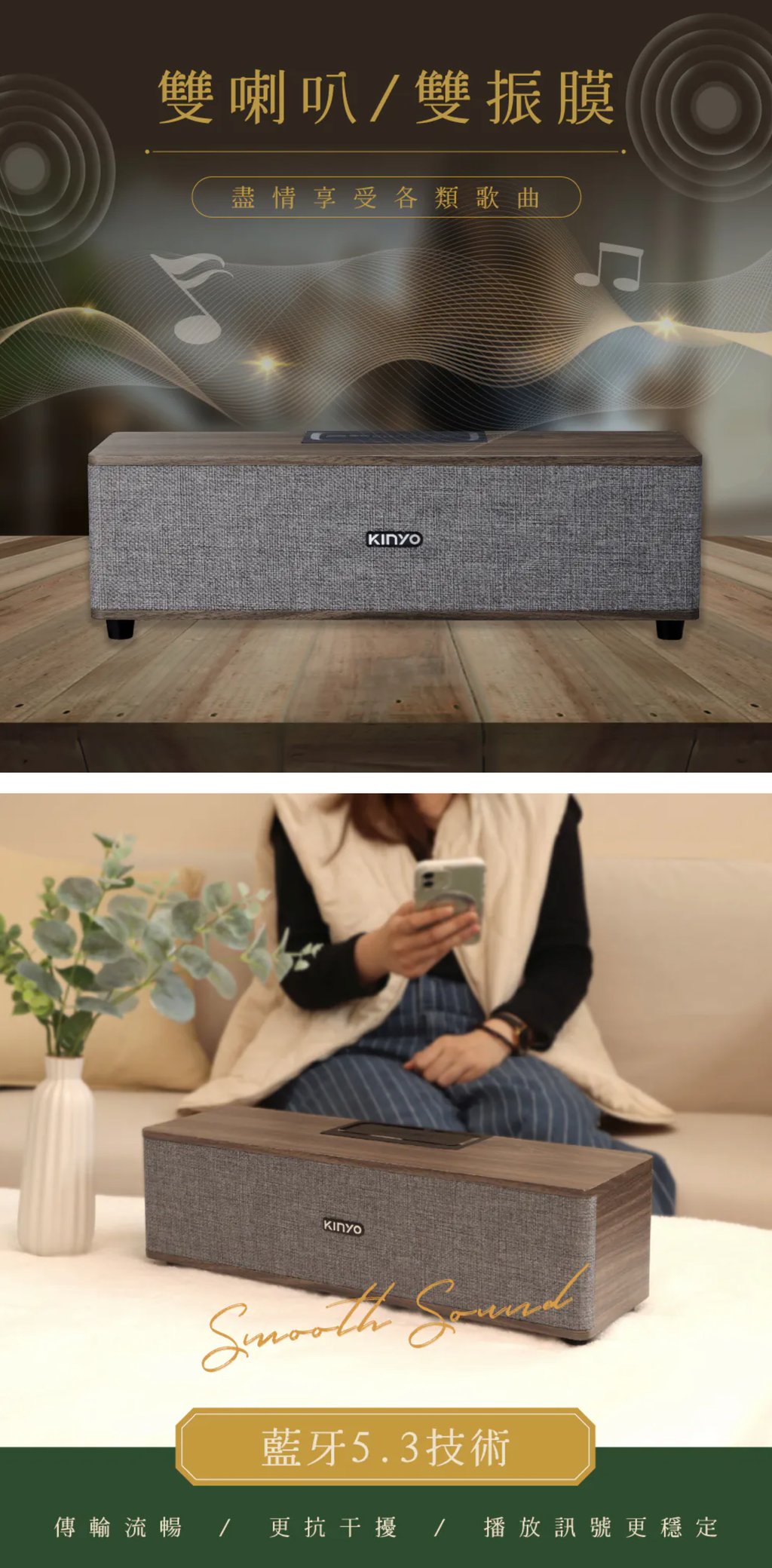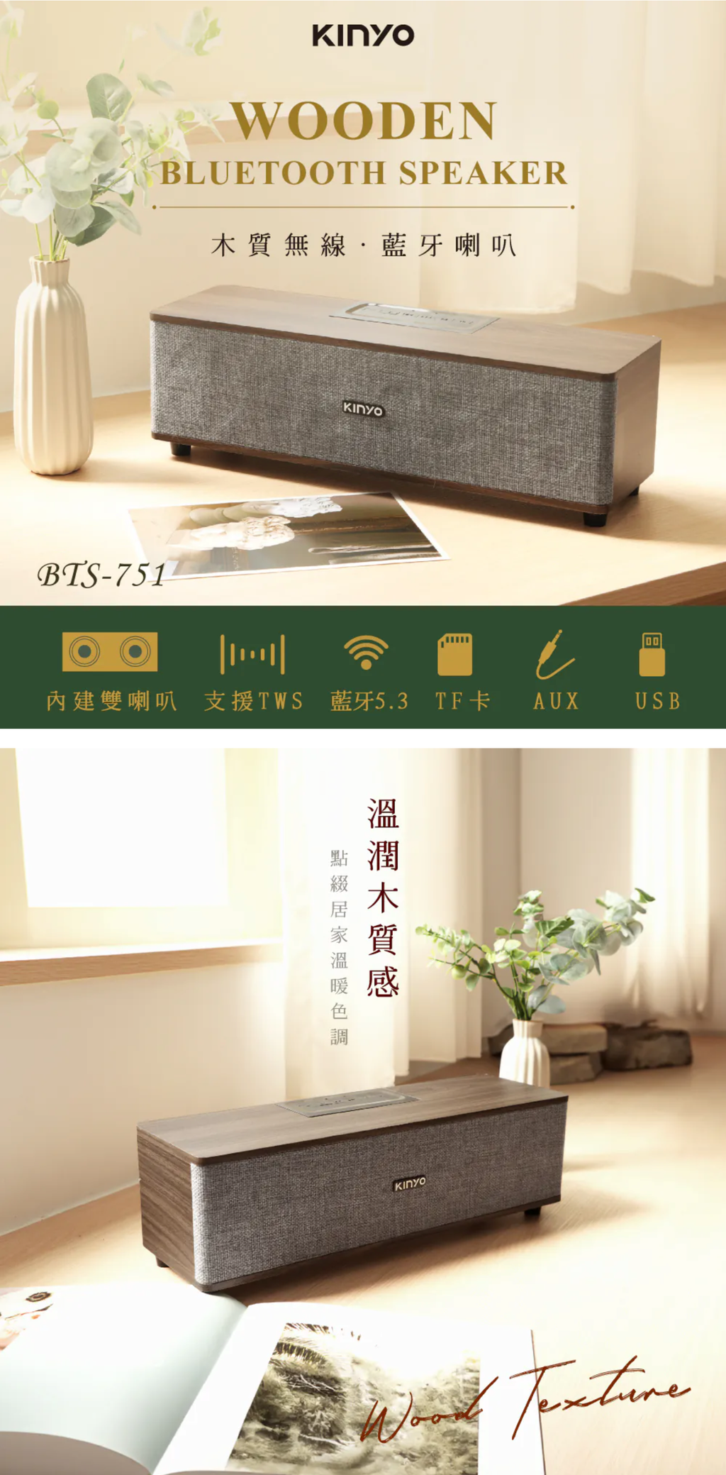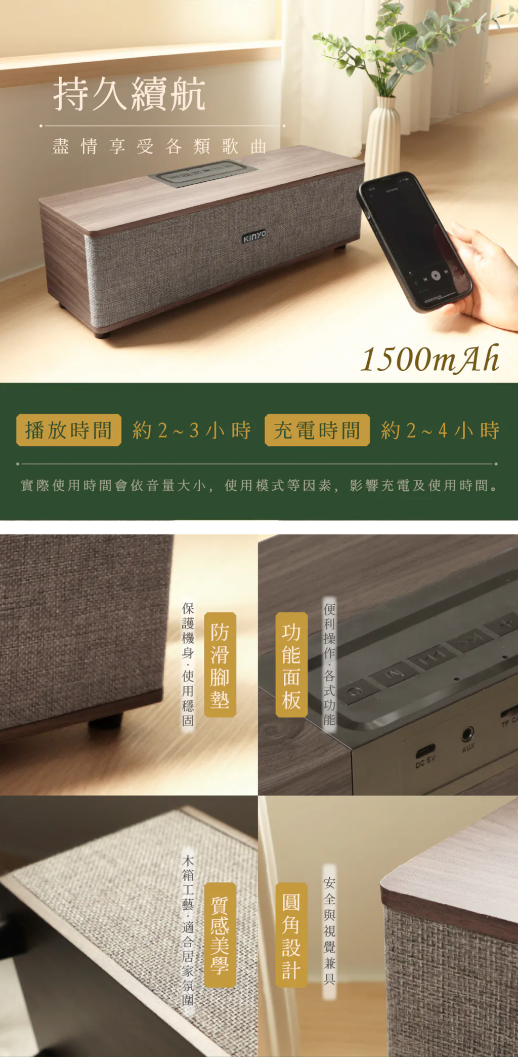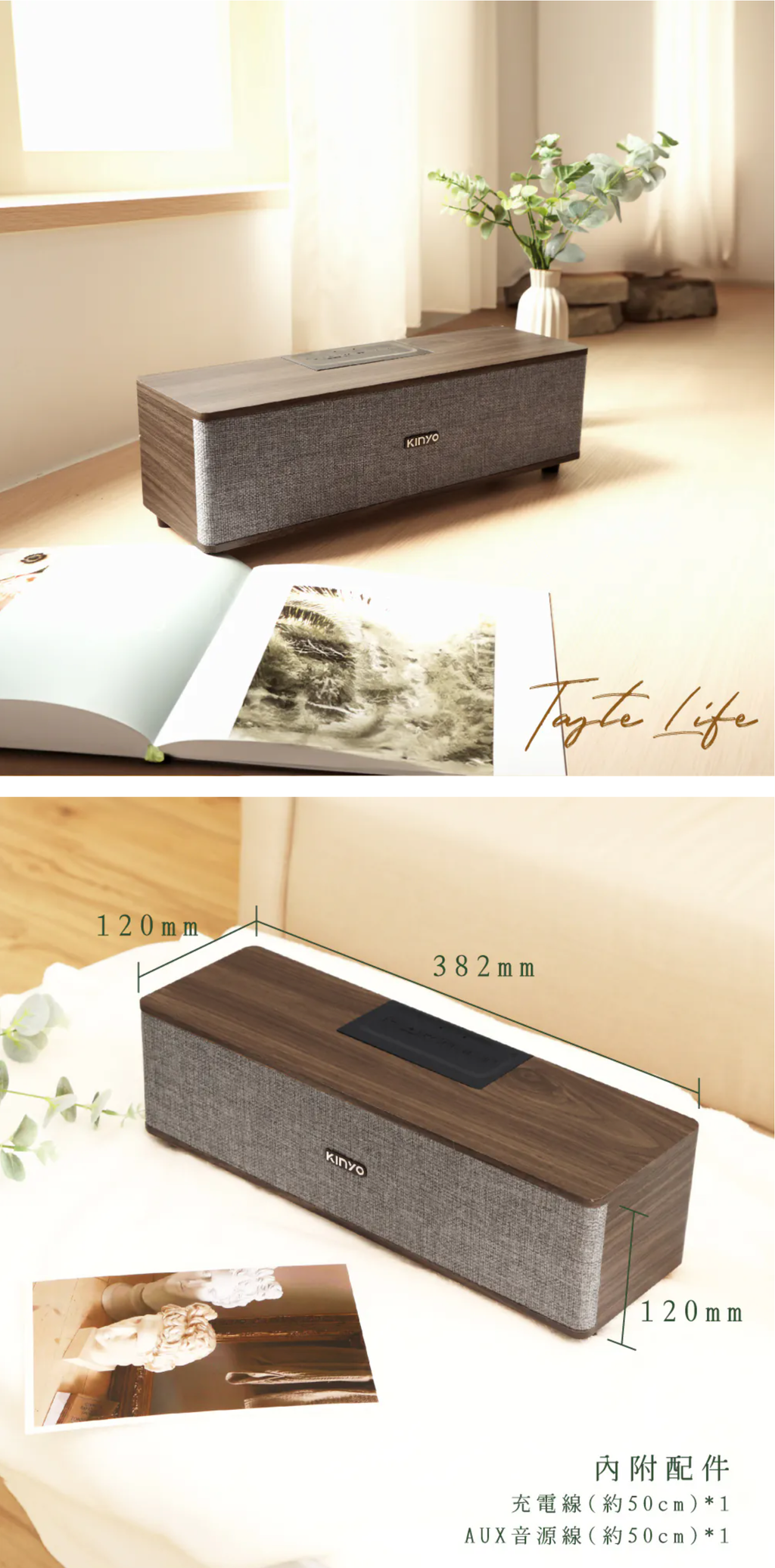 功能控制:開/關、模式切換、音量/曲目調整、播放暫停 音源輸入:藍牙、TF卡、USB隨身碟、AUX 介面:Bluetooth V5.3 最大接收距離:10M(無任何障礙環境) 輸出功率:RMS 16W (8W+8W) 額定電壓:DC 5V / 1A 電池規格:1500mAh / 3.7V 充電時間:約2~3小時 續航時間:連續使用約2~4小時 (實際會依環境溫度與使用模式等因素,影響充電及使用時間) 消耗電流:3.4A 喇叭單體:66mm 4Ω 8W 全音域喇叭x2 響應頻率:60Hz-20KHz 支援音樂格式:MP3 配件:充電線(約50cm)×1、AUX音源線(約50cm)x1 材質:木質、網布 產品重量:1473g 產品尺寸:W382 x H120 x D120 mm 包裝尺寸:W415 x H146 x D140 mm