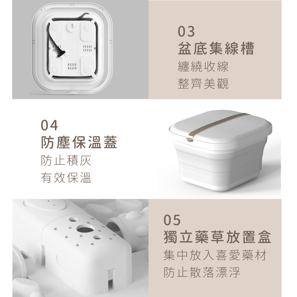 恆溫氣泡按摩-氣泡湧泉按摩,享受居家SPA 清爽無印風,契合現代人家居品味 折疊式設計,收納簡便、還可壁掛 輕巧 1.5 kg,單手好拿,攜帶方便 PTC陶瓷加熱,智能溫控恆溫舒適 白色經典風格,適合家居裝潢 自動紅光加熱,恆定溫暖足浴 按摩滾輪顆粒,加強足底穴位按摩 藥草放置盒-集中添加不接觸肌膚 吊掛收納-盆底集線槽與掛勾孔,收納更便利