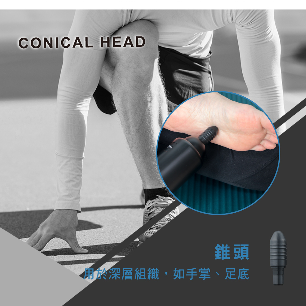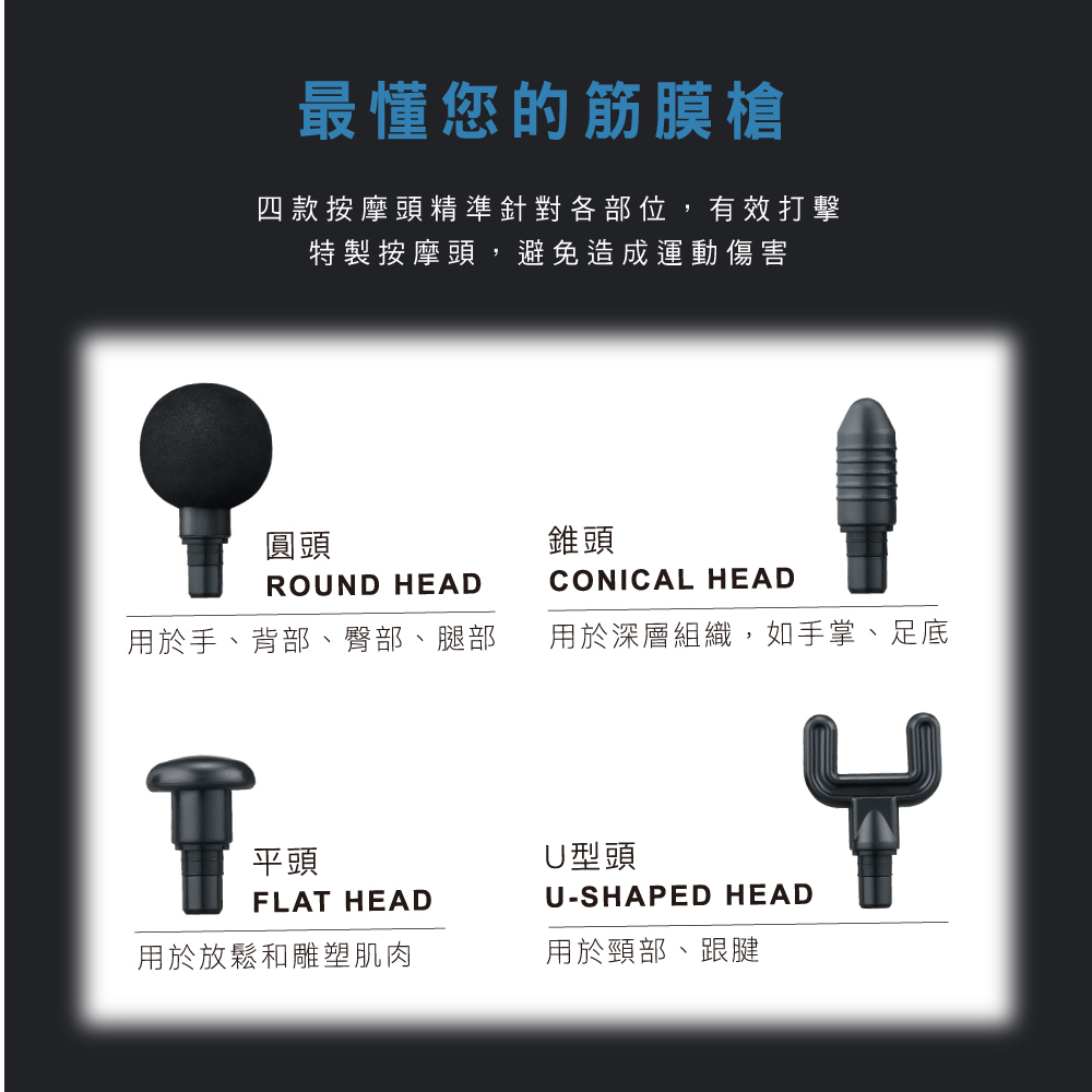一鍵開關/震速調節-簡單上手。 USB充電-插座、行動電源、電腦隨處可充。 續航時間3HR-最大馬力3200RPM。 六檔震速-針對不同身體狀況調整速度。 輕鬆更換四款按摩頭-舒緩全身各部位。