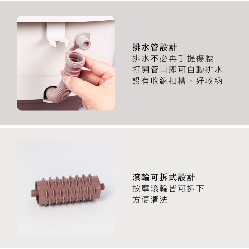 360度旋鈕控制,功能輕鬆選擇。 自動加熱,盡情享受熱水足浴。 PTC陶瓷加熱保溫,安全可靠。 盆底滑動式滾輪,加強穴位按摩。 藥草放置盒,可集中添加藥材。 防塵/防薰蒸蓋,保留熱氣減少蒸散。 省力提把,方便好移動。 為保障使用者安全,所有產品皆在裝水的情況下進行嚴謹的高壓漏電測試。 若新品桶内有殘水、水漬殘留為正常現象。 每一台足浴機皆通過安全測試,請安心使用。