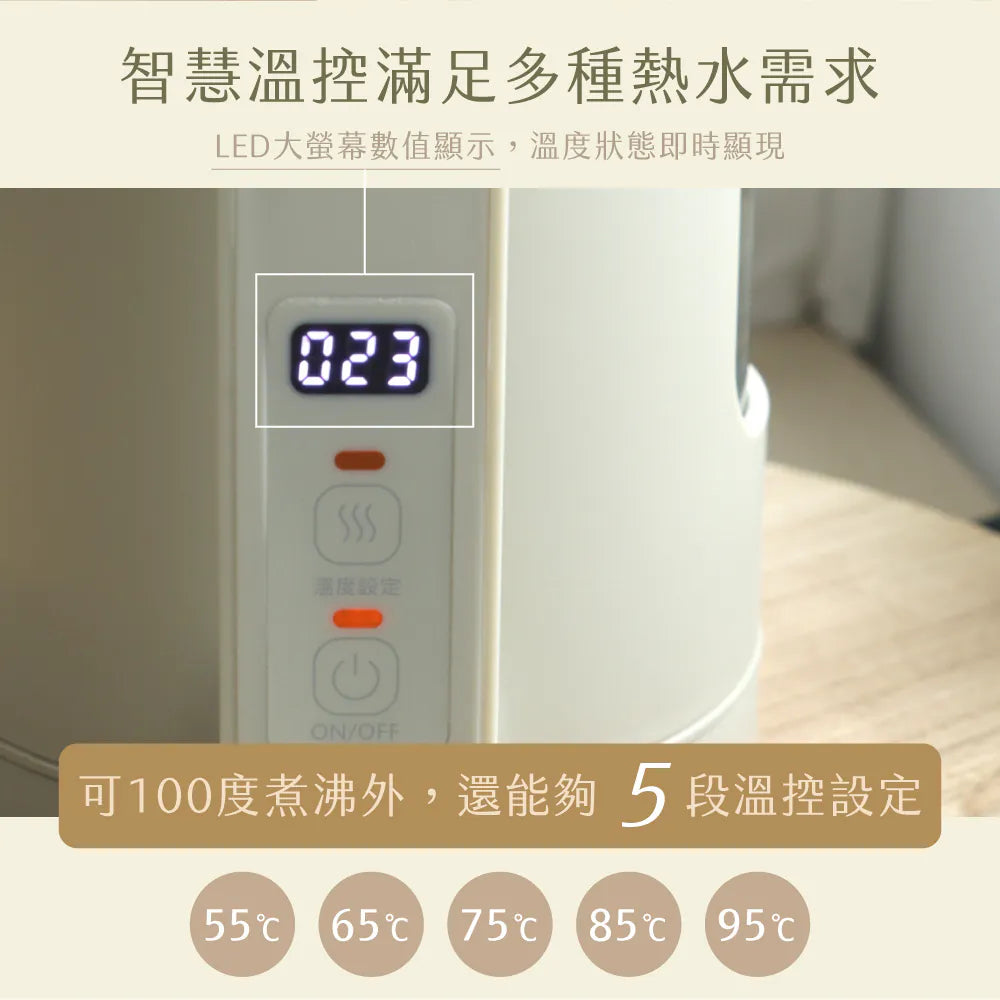 5段溫控設定:55℃ / 65℃ / 75℃ / 85℃ / 95℃ 生水煮沸、開水回溫,自由選擇控溫模式。 LED螢幕顯示,溫度即時顯現。 觸控式螢幕面板,簡單好上手。 90分鐘保溫時間,隨時滿足熱水需求。 食品級SUS 304不鏽鋼厚實材質,高保溫高儲熱。 1100W高功率,10分鐘快速加熱沸騰。 1.5L大容量,備足一次煮水量。 13.5cm大口徑清潔零死角。 雙層防燙壺身,安全不燙手。 無接縫內膽,減少藏汙納垢安全衛生。 360度分離式底座,拿起壺身即斷電。 多重防護機制,沸騰斷電、過熱保護、防乾燒保護。 保固說明:非人為因素之損壞,原廠保固一年。 使用前請確實遵從產品說明書內之操作指示及注意事項。 如需辦理退換貨,包裝與配件須完整(商品配件、包裝完整,無刮痕損傷)。 產地:中國