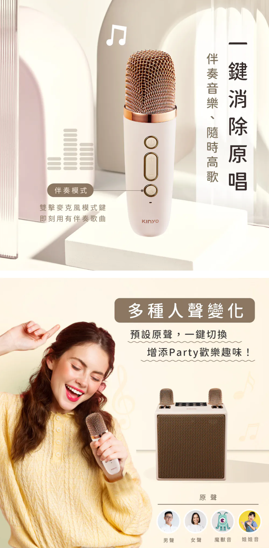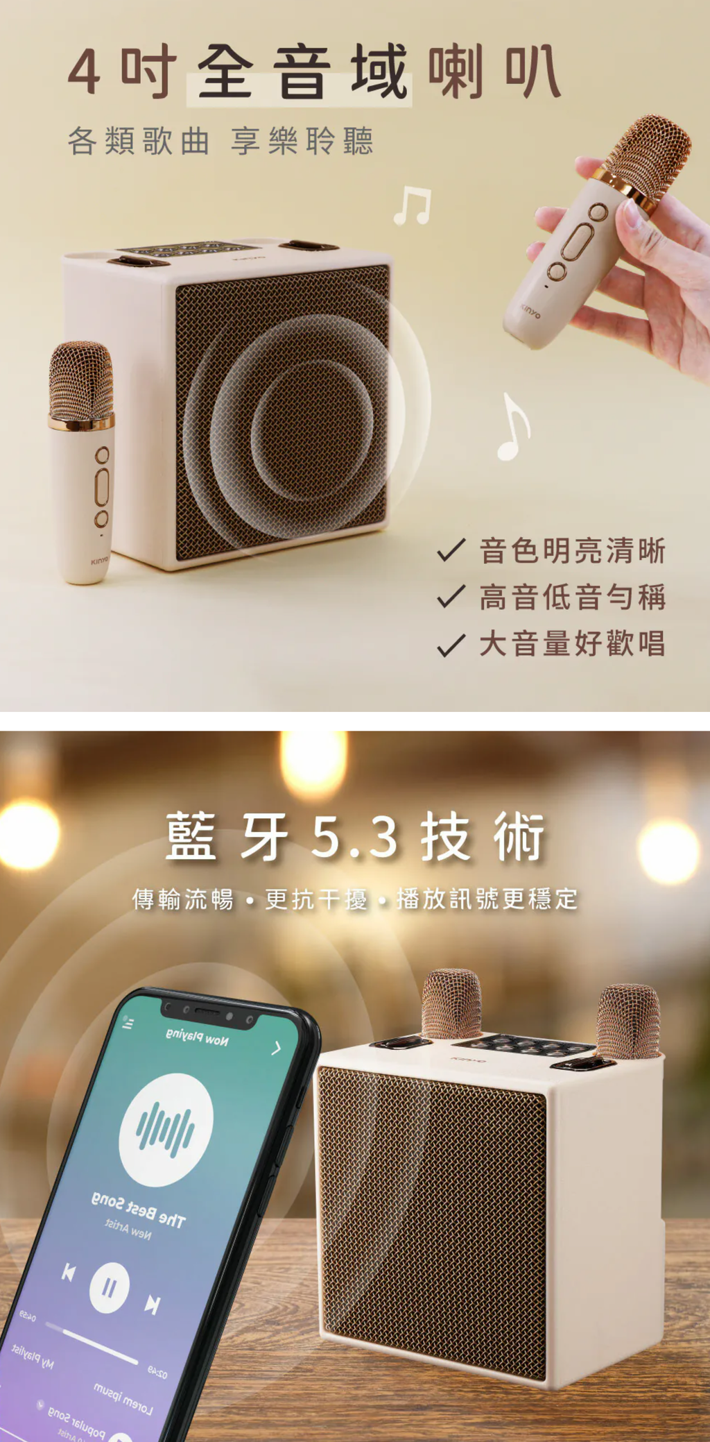 功能控制:開/關、模式切換、音量/曲目調整、播放暫停、RGB燈效切換、麥克風音效調整、麥克風混響/回聲調整、麥克風伴奏模式切換 音源輸入:藍牙、TF卡、USB隨身碟 介面:Bluetooth V5.3 最大接收距離:10M(無任何障礙環境) 輸出功率:RMS 5W 額定電壓:5V ?1A 額定電流:1A 使用電源:3.7V / 1500mAh 充電時間:約3~4小時 滿電續航時間:約3~4小時 (實際會依環境溫度與使用模式等因素,影響充電及使用時間。) 信噪比:?83dB 喇叭單體:4吋4Ω 10W全音域喇叭X1 響應頻率:20Hz-20KHz 支援音樂格式:MP3 材質:ABS塑膠+鐵網 麥克風: 貨號:KY-2040-1 認證型號:KY-2022-1 功能控制:開/關、麥克風音量調整、播放暫停、音效切換、伴奏模式 介面:Bluetooth V5.3 規格:電容式 額定電壓:DC 5V / 1A 消耗電流:17mA 電池規格:500mAh / 3.7V 充電時間:約1~2小時 續航時間:約1~2小時 ※實際會依環境溫度與使用模式等因素,影響充電及使用時間。 材質:ABS塑膠+鐵網 產品重量: 音箱911g、麥克風約85g 產品尺寸: 音箱W170*H170 *D135 mm 麥克風約θ37 x H135 mm 包裝尺寸:W195*H160 *D232 mm 配件:無線麥克風x2、充電線(約50cm) x1、背帶x1