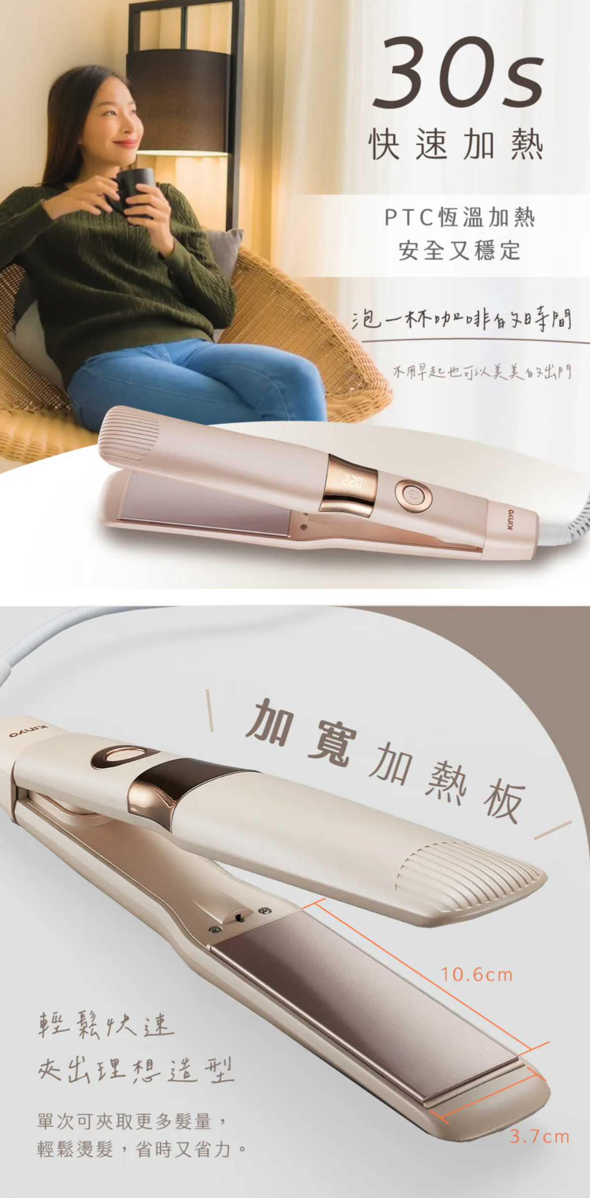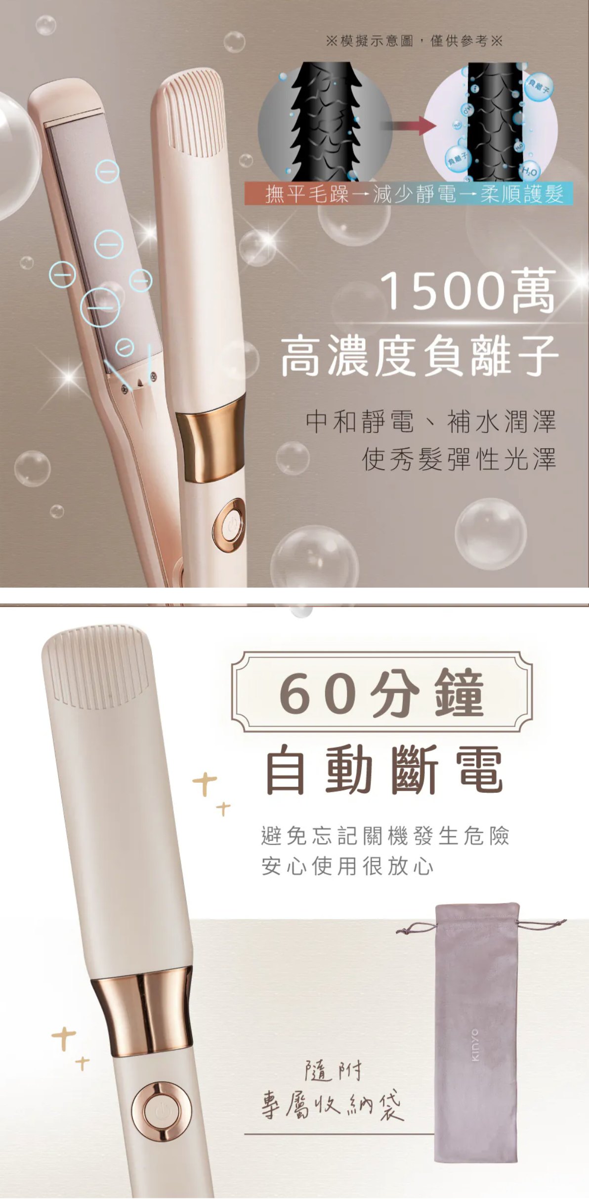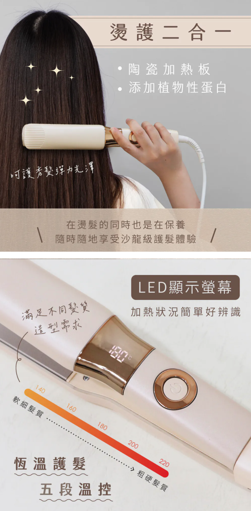 10.6X3.7cm超大加熱板,輕鬆燙髮,省時又省力 140/160/180/200/220C°五檔溫控,滿足不同髮質造型需求 1500萬高濃度外噴式負離子,撫平毛躁,水潤光澤 液晶螢幕顯示,使用狀態、當前溫度一目瞭然 安心自動斷電設計,安全無憂 360度旋轉護線套,使用不卡手 貼心旅行鎖設計,方便閉合好收納 隨附專屬收納袋 保固說明:非人為因素之損壞,原廠保固一年。 使用前請確實遵從產品說明書內之操作指示及注意事項。 如需辦理退換貨,包裝與配件須完整(商品配件、包裝完整,無刮痕損傷)。 產地:中國