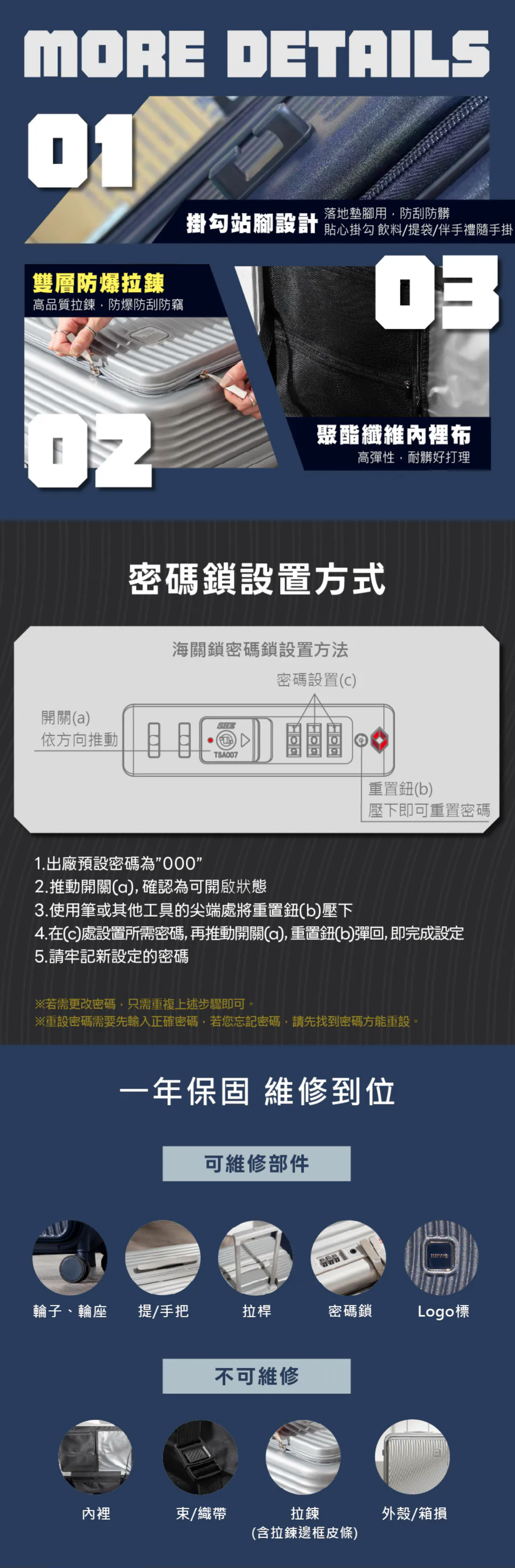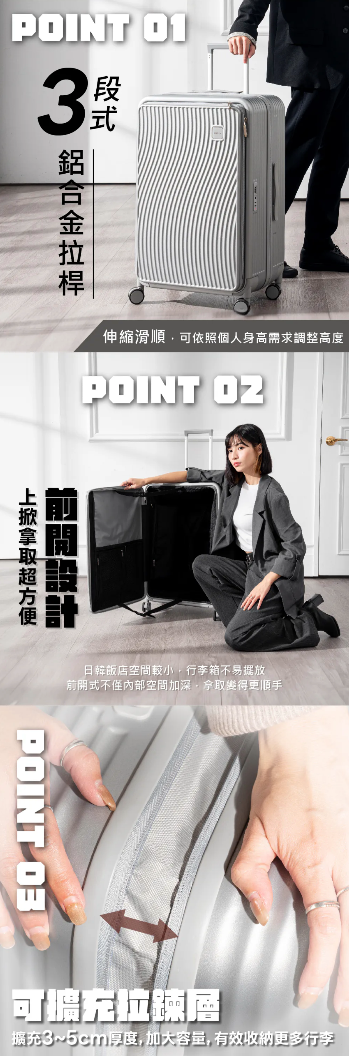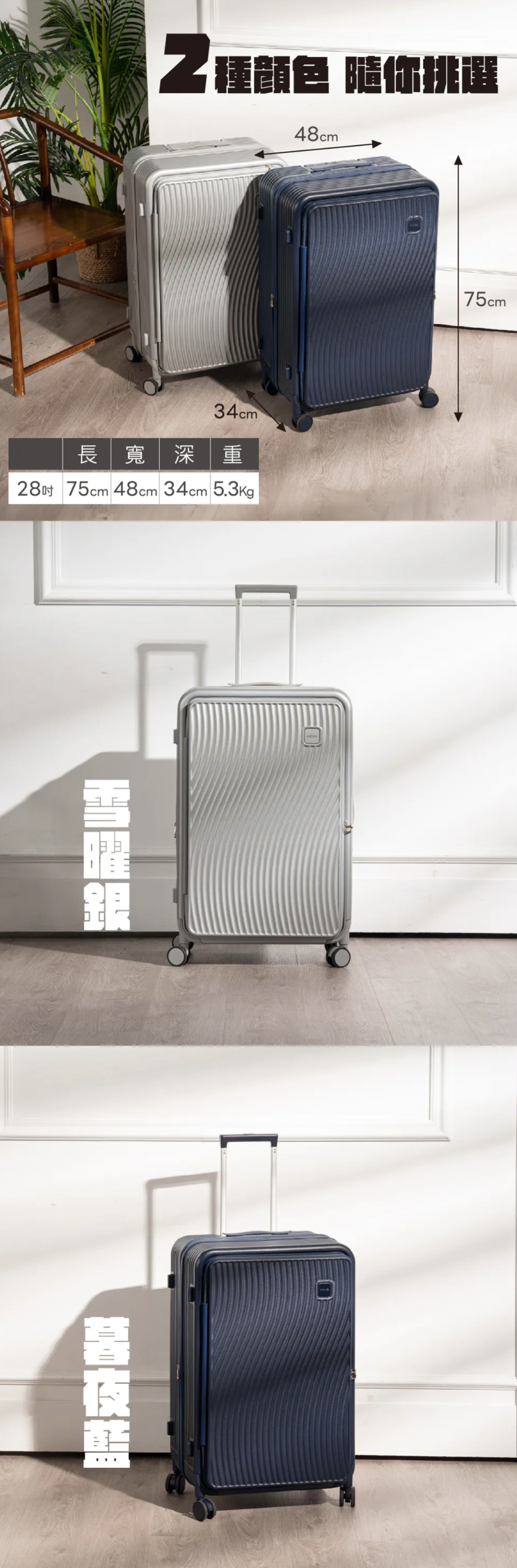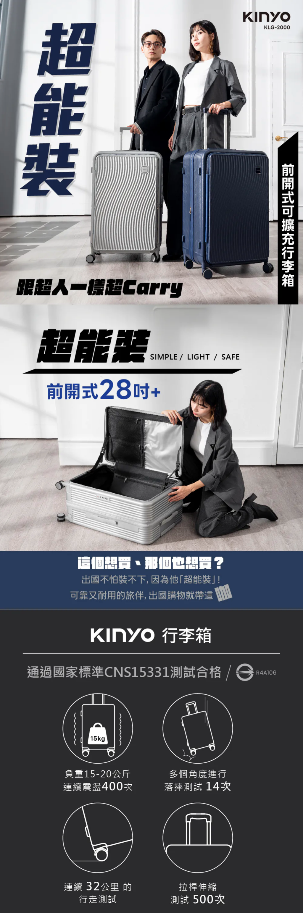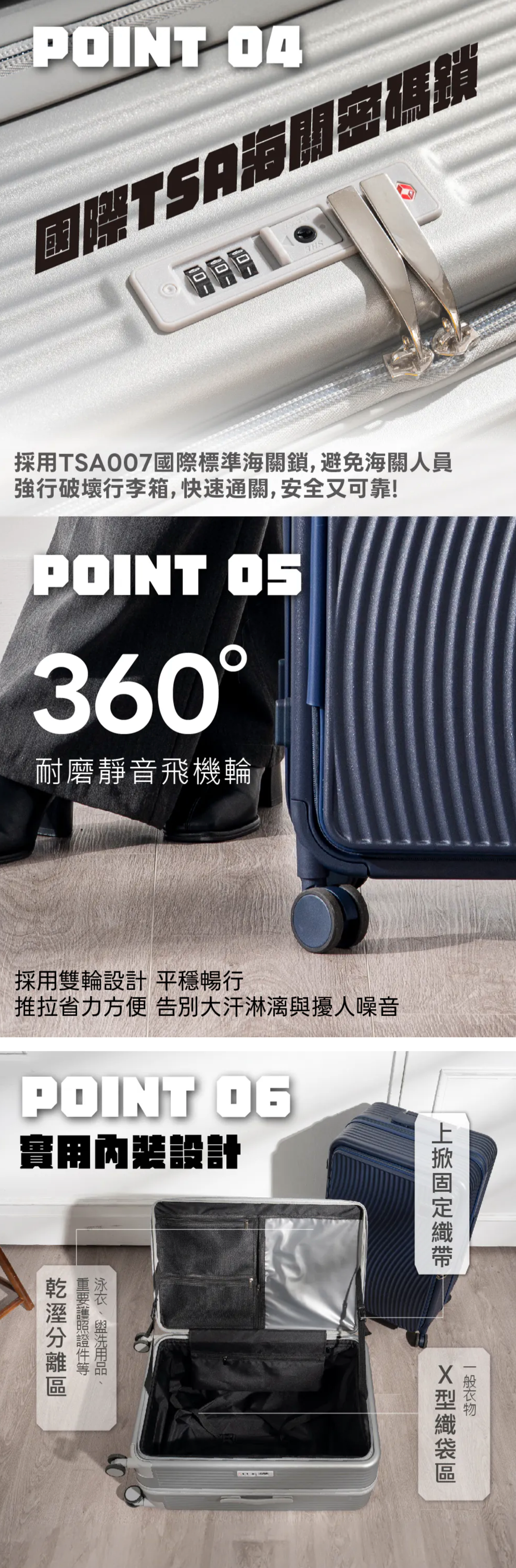 前開式隔層附加3cm擴充層,容量再升級! 乾濕分離收納層,分區存放,乾淨整潔 360度萬向靜音雙輪,平滑順暢,輕鬆推行 側邊掛鉤設計,方便掛放隨身物品 雙層防爆拉鍊,耐用安全,防止爆裂 符合國家標準CNS 15331,品質管理有保障 使用前請確實遵從產品說明書內之操作指示及注意事項。 如需辦理退換貨,包裝與配件須完整(商品配件、包裝完整,無刮痕損傷)。 產地:中國