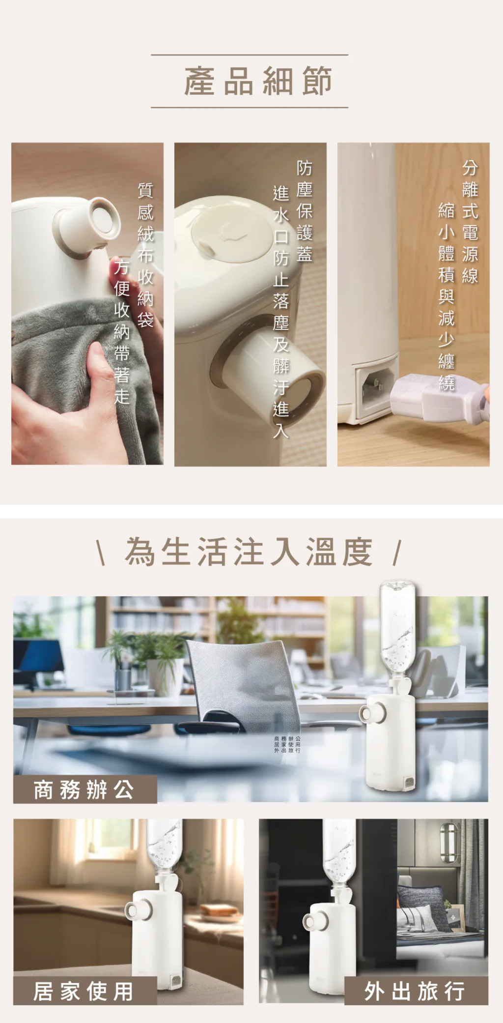額定電壓:110V 額定頻率:60Hz 總額定消耗電功率:900W 配件:30mm瓶口轉接頭、1M外接式水管、分離式電源線、旅行袋 產品材質:304不鏽鋼、ABS塑膠、PP塑膠、鋁合金 產品尺寸:96*178*98mm 產品重量:主機570g;含配件610g±10% 包裝尺寸:W145*D145*H222mm