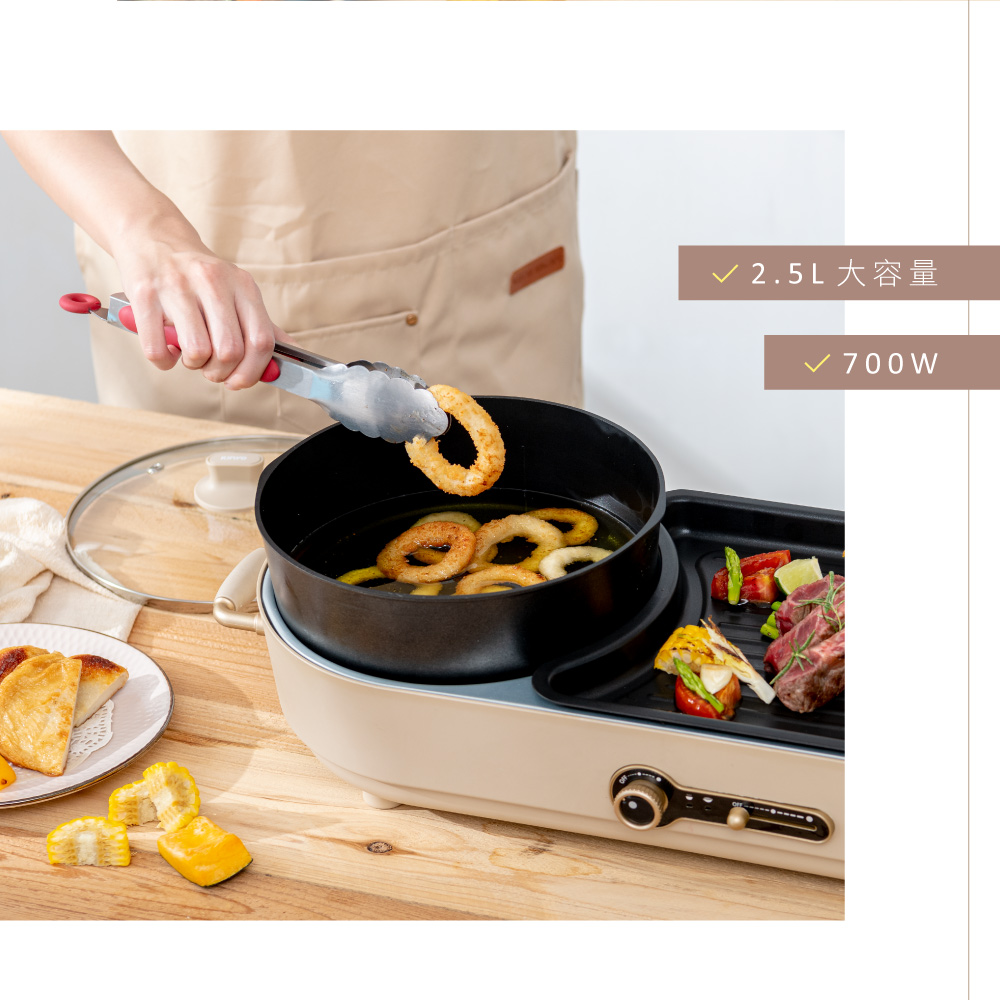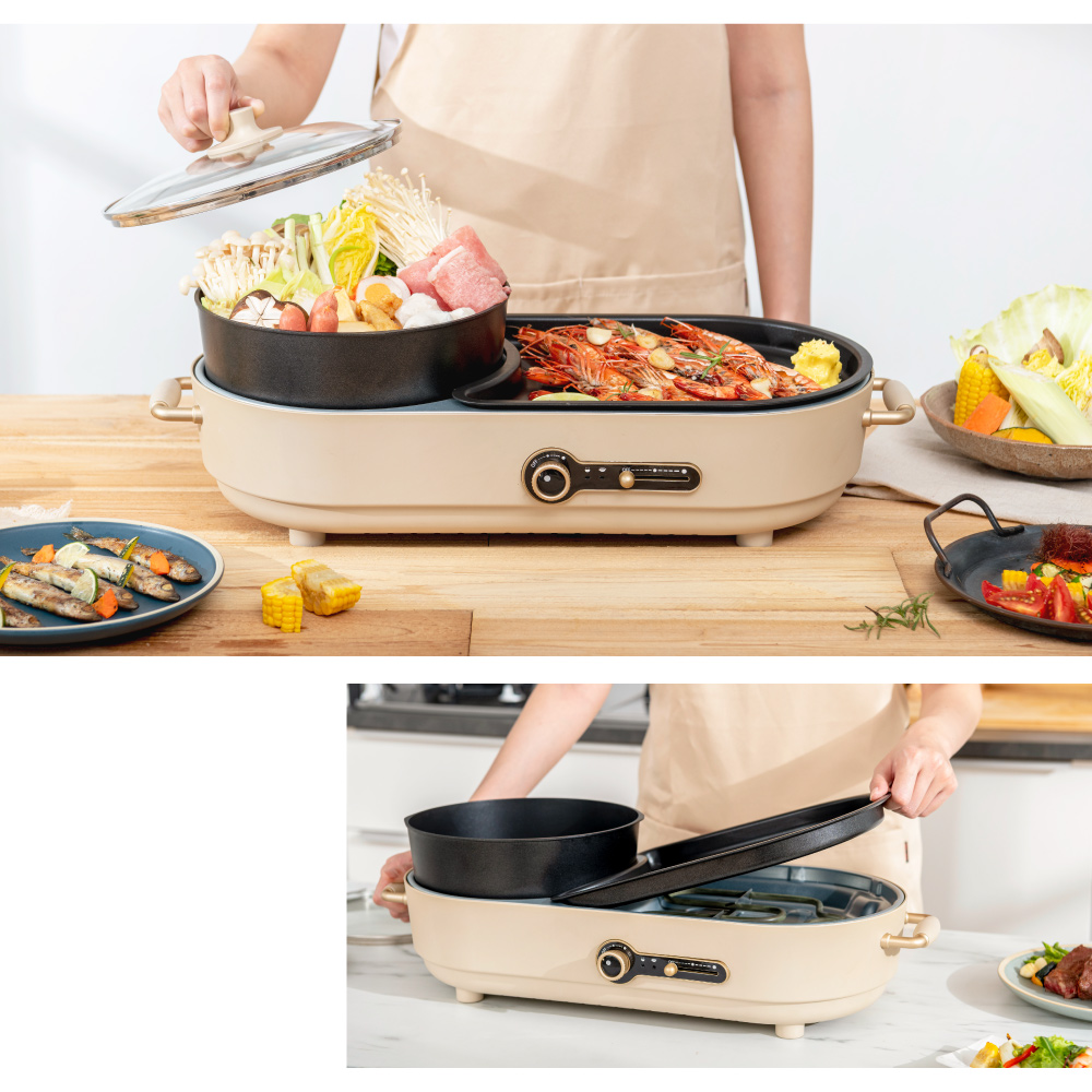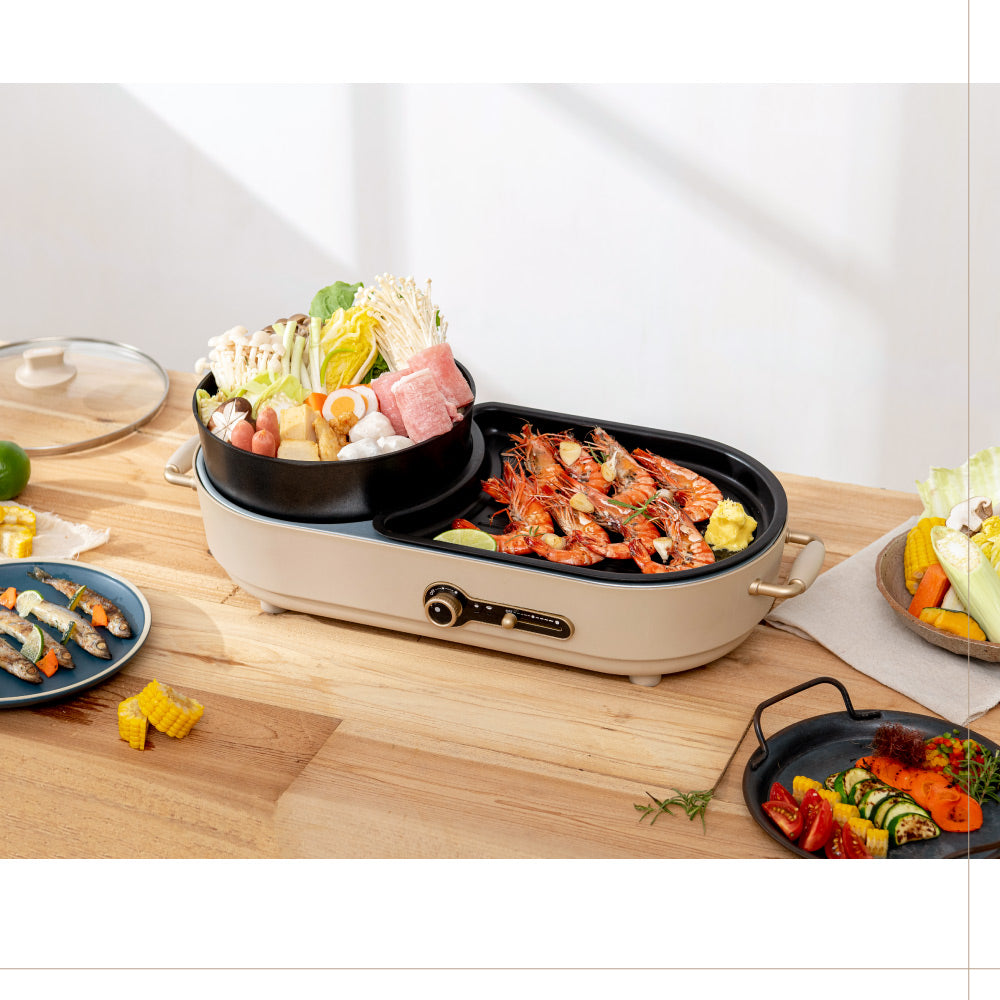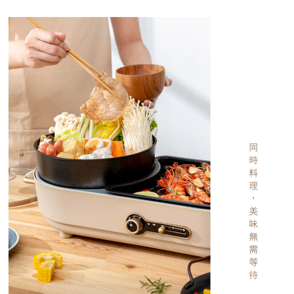 煎/煮/炒/炸/涮/燉/烤,多元料理一次滿足 火鍋、烤盤獨立溫控設計,獨立雙邊控溫,同時料理不干擾 1300W高功率,急速均勻加熱,美味無需等待 火鍋大容量2.5L,輕鬆滿足多人料理,聚餐首選 烤盤加高深度24mm,貼心設計,料理不易噴濺 食品級不沾,烹煮不黏鍋,清洗一抹即淨 分離式設計,可拆式鍋身、烤盤,快速清潔好方便 多重保護裝置,防乾燒、高溫過熱斷電、底部快速散熱孔 貼心防燙把手,耐熱不燙手,移動安全便利 耐高溫透明玻璃上蓋,隨時掌握進度,烹煮狀況一目了然