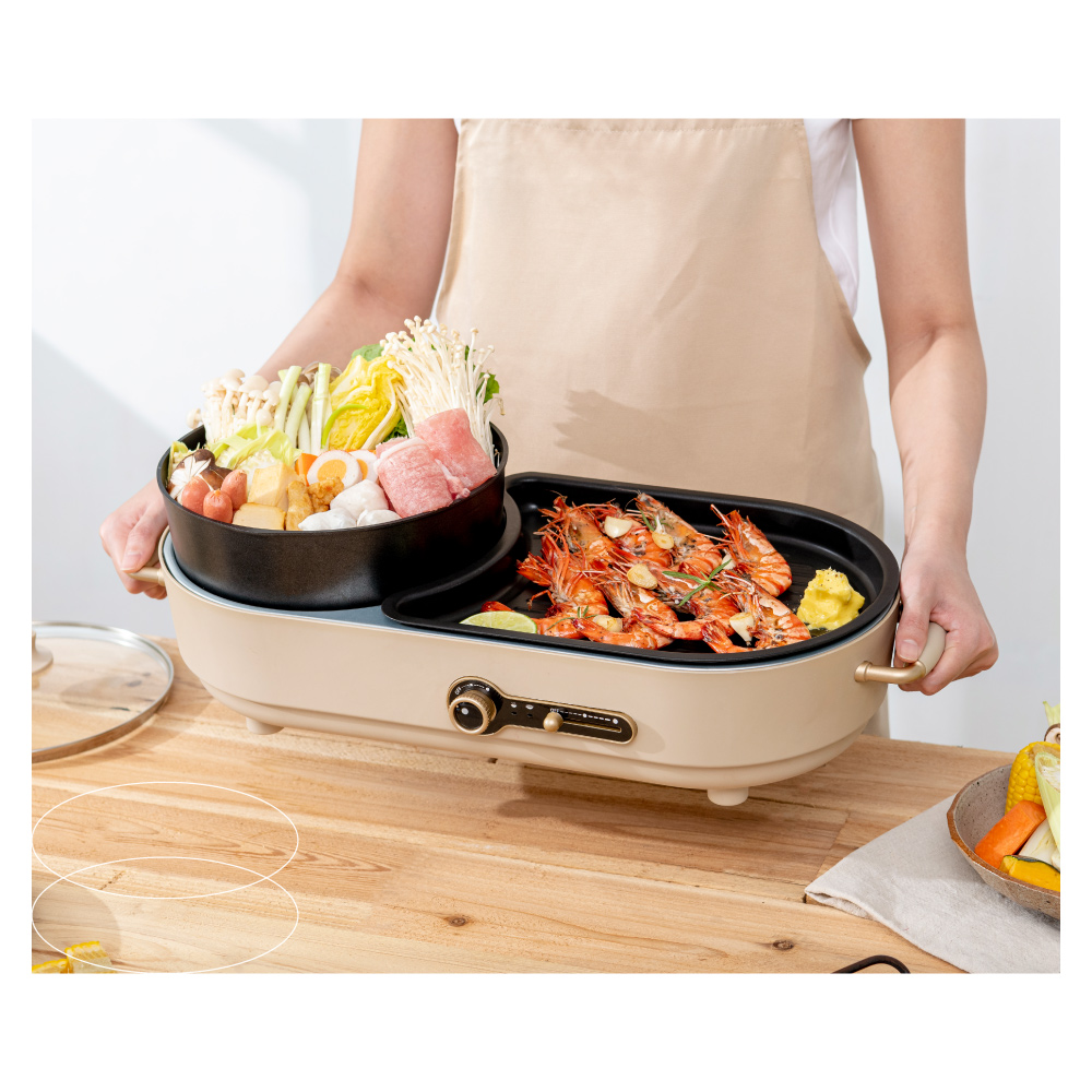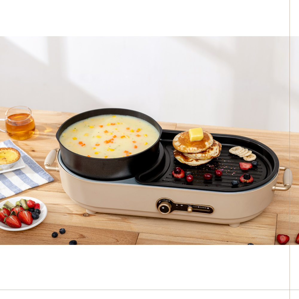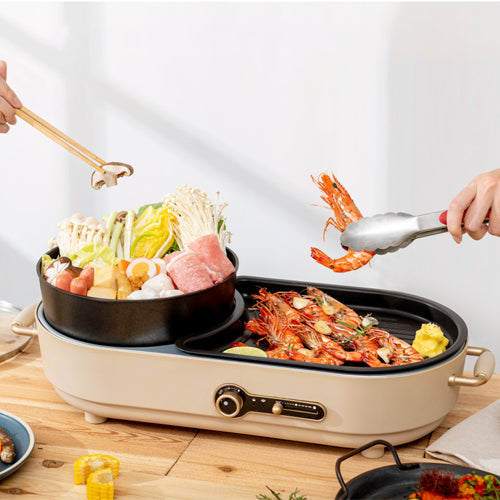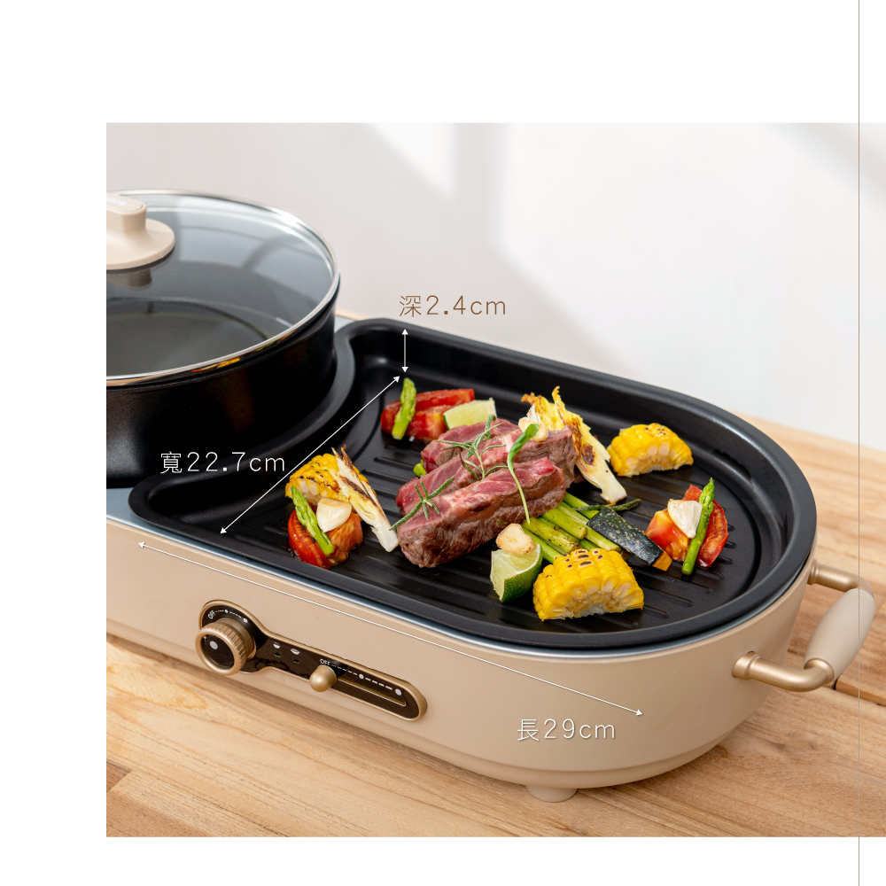 煎/煮/炒/炸/涮/燉/烤,多元料理一次滿足 火鍋、烤盤獨立溫控設計,獨立雙邊控溫,同時料理不干擾 1300W高功率,急速均勻加熱,美味無需等待 火鍋大容量2.5L,輕鬆滿足多人料理,聚餐首選 烤盤加高深度24mm,貼心設計,料理不易噴濺 食品級不沾,烹煮不黏鍋,清洗一抹即淨 分離式設計,可拆式鍋身、烤盤,快速清潔好方便 多重保護裝置,防乾燒、高溫過熱斷電、底部快速散熱孔 貼心防燙把手,耐熱不燙手,移動安全便利 耐高溫透明玻璃上蓋,隨時掌握進度,烹煮狀況一目了然