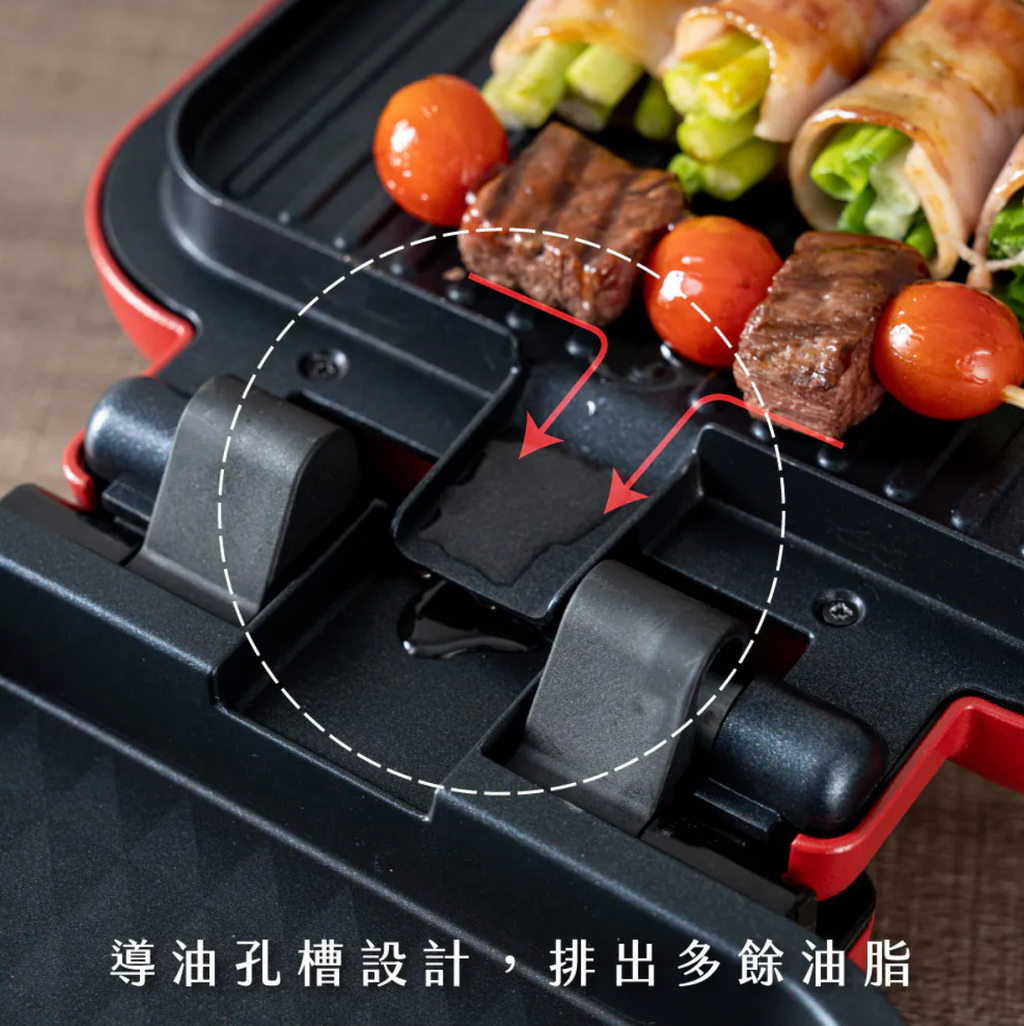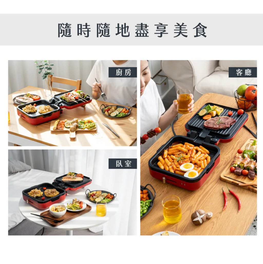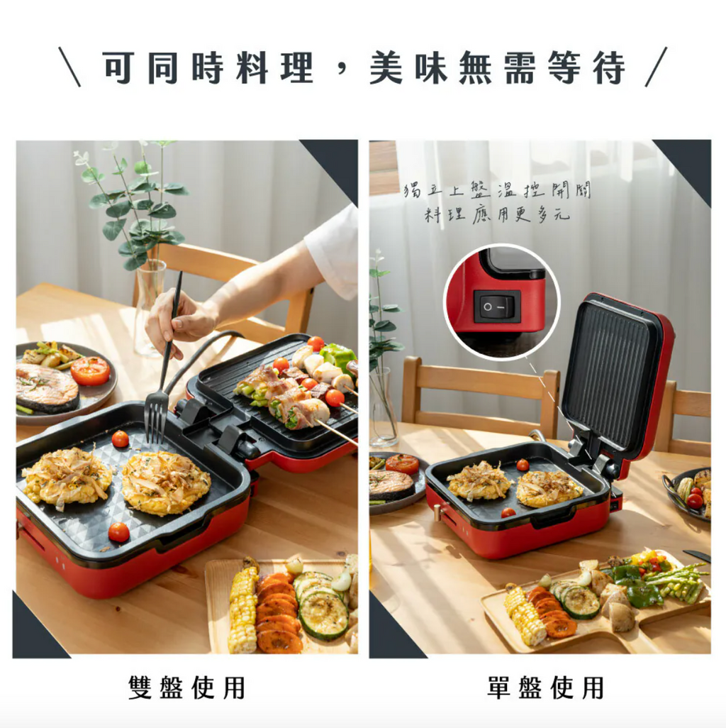 * 雙盤設計,獨立加熱開關,料理應用更多元。 * 上下盤可同時加熱,上盤可單獨關閉溫控。 * 三檔控溫,最高溫200度C,不同料理自由選擇。 * 上盤高溫快速加熱,下盤中低溫烹調,依食材特性可同時料理。  * 21x21cm可拆式平底煎盤,立體紋路減少食材沾黏。 * 20x20cm固定式油切烤盤,導油孔槽設計,排出多餘油脂。 * 鋁壓鑄+不沾塗層導熱均勻,通過LFGB食品級認證,使用更安心。 * 可180度折疊收納,不占空間收納更方便。 * 具安全防護設計:防乾燒過熱斷電保護、防火阻燃材質。