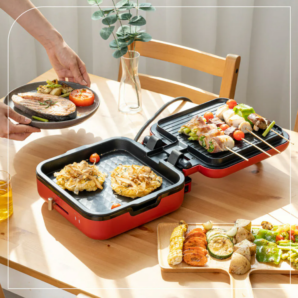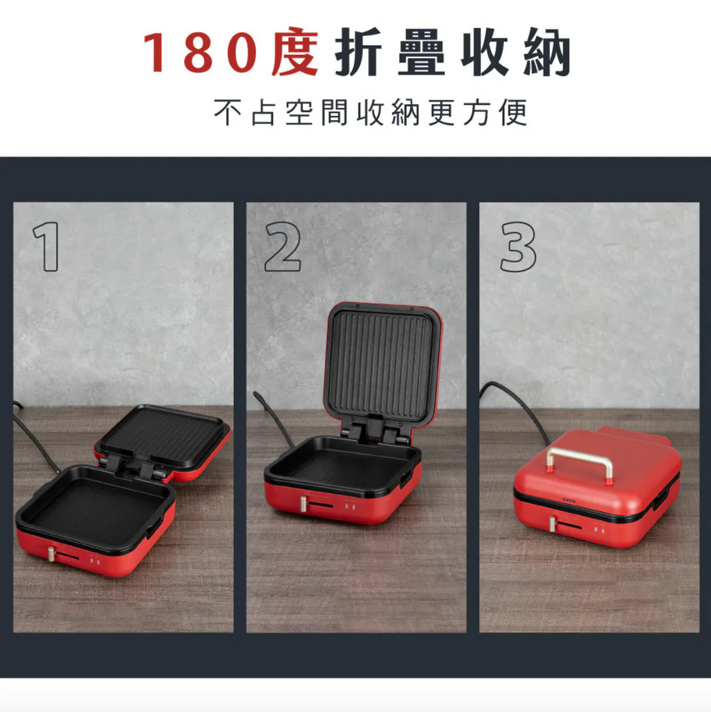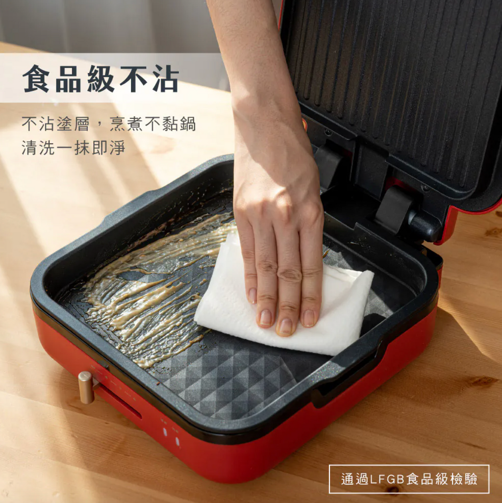 * 雙盤設計,獨立加熱開關,料理應用更多元。 * 上下盤可同時加熱,上盤可單獨關閉溫控。 * 三檔控溫,最高溫200度C,不同料理自由選擇。 * 上盤高溫快速加熱,下盤中低溫烹調,依食材特性可同時料理。  * 21x21cm可拆式平底煎盤,立體紋路減少食材沾黏。 * 20x20cm固定式油切烤盤,導油孔槽設計,排出多餘油脂。 * 鋁壓鑄+不沾塗層導熱均勻,通過LFGB食品級認證,使用更安心。 * 可180度折疊收納,不占空間收納更方便。 * 具安全防護設計:防乾燒過熱斷電保護、防火阻燃材質。