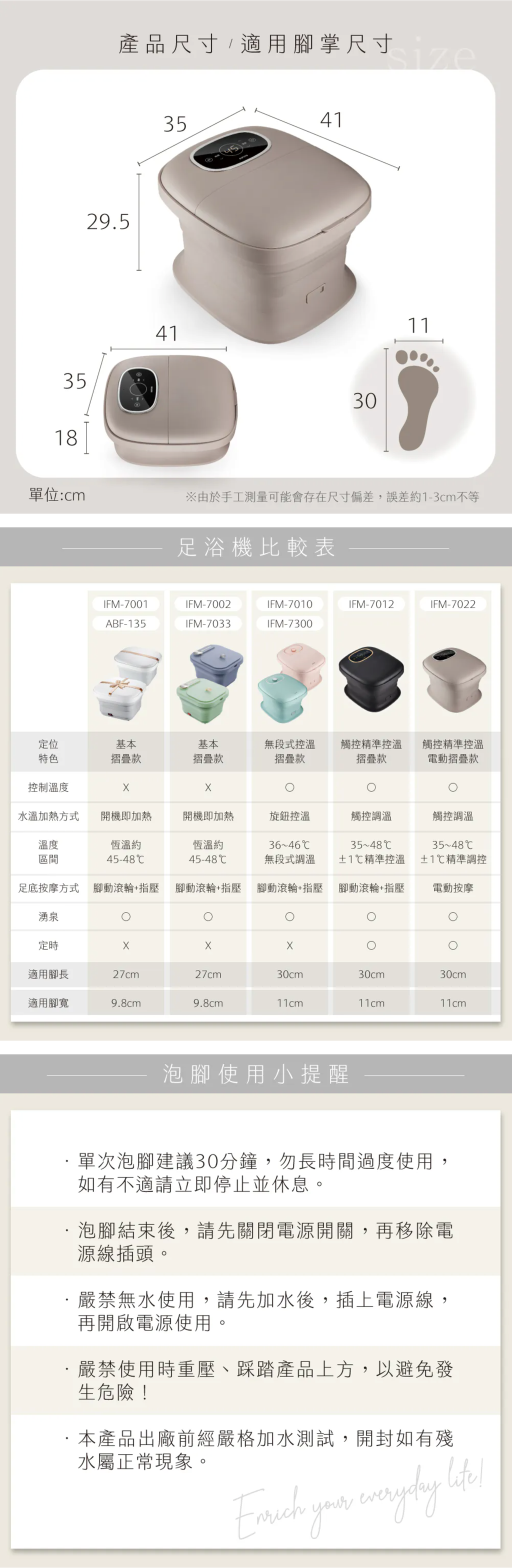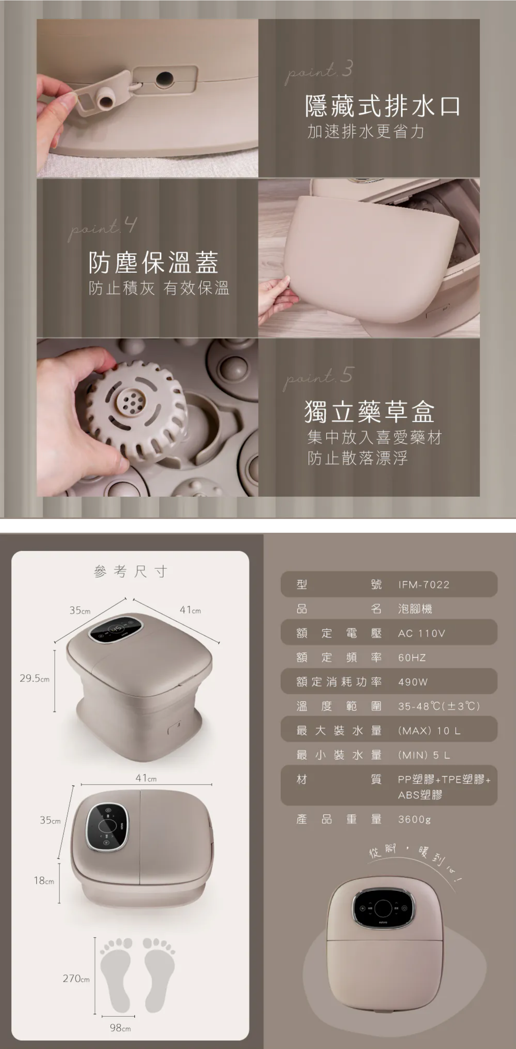 額定電壓:AC 110V 額定頻率:60HZ 額定消耗功率:490W 溫度範圍:35-48℃(±3℃) 最大裝水量:(MAX) 10L 最小裝水量:(MIN) 5L 材質:PP塑膠+TPE塑膠+ABS塑膠 產品尺寸: 展開-W350xH295xD410mm 摺疊-W350xH180xD410mm