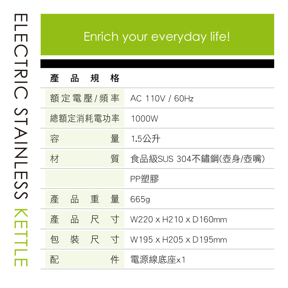 額定電壓/頻率:AC 110V / 60Hz 總額定消耗電功率:1000W 容量:1.5公升 材質:食品級SUS 304不鏽鋼(壺身/壺嘴)、PP塑膠 配件:電源線底座x1 產品尺寸: W220xH210xD160 mm 產品重量: 665 g 包裝尺寸: W195xH205xD195 mm 授權碼V20123101