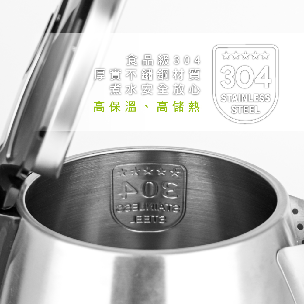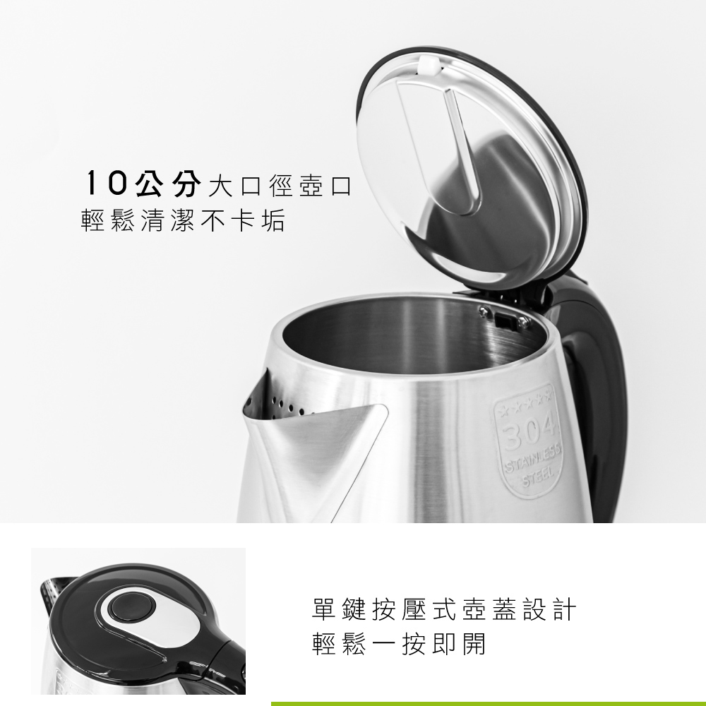 食品級SUS 304不鏽鋼厚實材質,高保溫高儲熱。 1000W高功率,快速加熱沸騰。 1.5公升容量,滿足一次的煮水量。 沸騰斷電設計,安全又放心。 加熱指示燈,隨時清楚煮水狀態。 一鍵操作,輕鬆煮。 自動偵測壺內水量,無水即停止加熱、防止乾燒。 360度旋轉分離式底座設計,任何角度拿取放置皆方便。 單鍵按壓式壺蓋設計,輕鬆一按即開。
