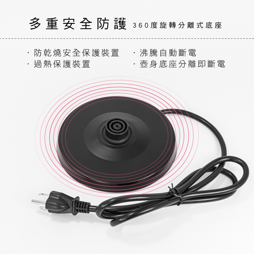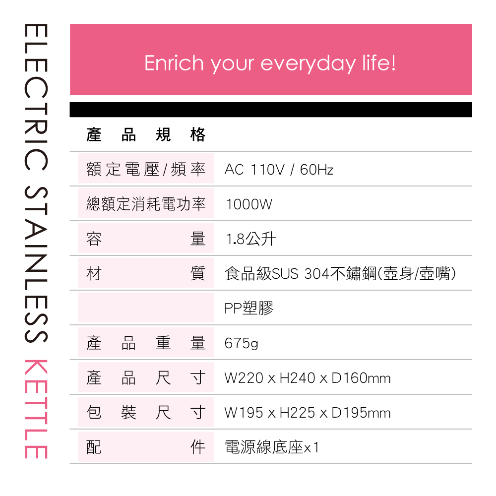 食品級SUS 304不鏽鋼厚實材質,高保溫高儲熱。 1000W高功率,快速加熱沸騰。 1.8公升容量,滿足一次的煮水量。 沸騰斷電設計,安全又放心。 加熱指示燈,隨時清楚煮水狀態。 一鍵操作,輕鬆煮。 自動偵測壺內水量,無水即停止加熱、防止乾燒。 360度旋轉分離式底座設計,任何角度拿取放置皆方便。 單鍵按壓式壺蓋設計,輕鬆一按即開。