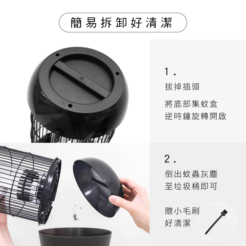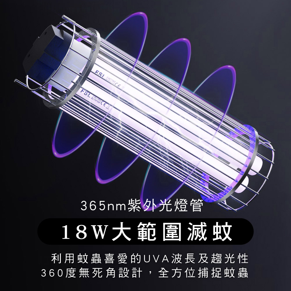瞬間電擊 特製密集電網,捕殺蚊蟲不漏抓。 360度環形電網,無死角滅捕蚊蟲效果佳。 有效誘蚊 捕蚊光波365nm,特殊耐用紫外線燈管, 長壽長效,誘蚊時效長。 高瓦數18W燈管,誘蚊更有效。 安全保障 採用對人體無害的UVA紫外線燈管。 物理性誘捕技術,無毒更安心。 全機採用防阻燃材質,沒有化學物質,使用安全、堅固耐用,無高壓電擊危險。 通過國家最新安全規格檢驗合格商品。 遠離登革熱,守護健康。 外觀設計 360度弧形外觀設計,簡單俐落線條,兼具 時尚感。 旋轉可拆卸獨立式集蚊盒,方便好清潔。 附提把,好拿取移位,可放置亦可吊掛。 附毛刷,便利清掃蚊蟲,不沾手。