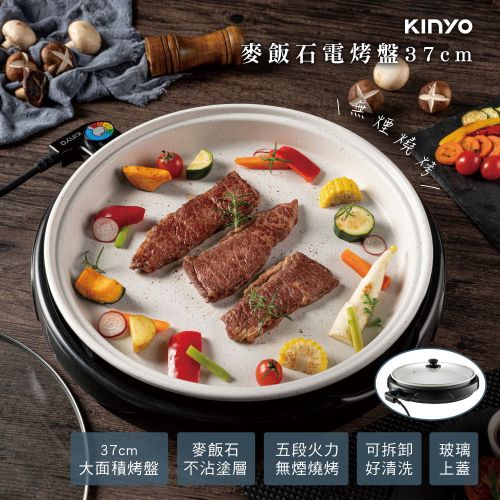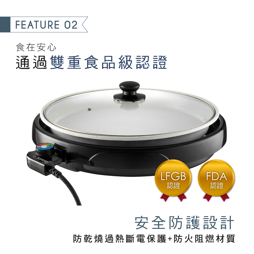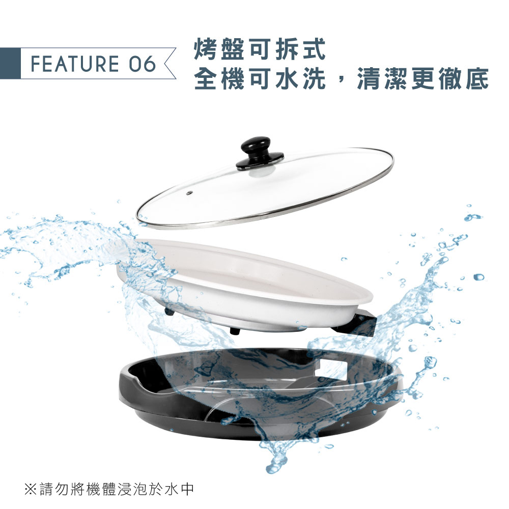 37cm超大面積烤盤+薄型機身設計,家庭聚餐首選。 五段火力,最高240高溫,根據不同料理自由選擇。 不沾塗層、烤盤可拆卸好清洗,通過LFGB/FDA雙重食 品級認證,安心使用。 分離式溫控器設計,安全收納方便。 底部大面積加熱管,加熱快速均勻。 附玻璃上蓋,料理方式更方便多元。 安全防護設計,防乾燒過熱斷電保護、防火阻燃材質。