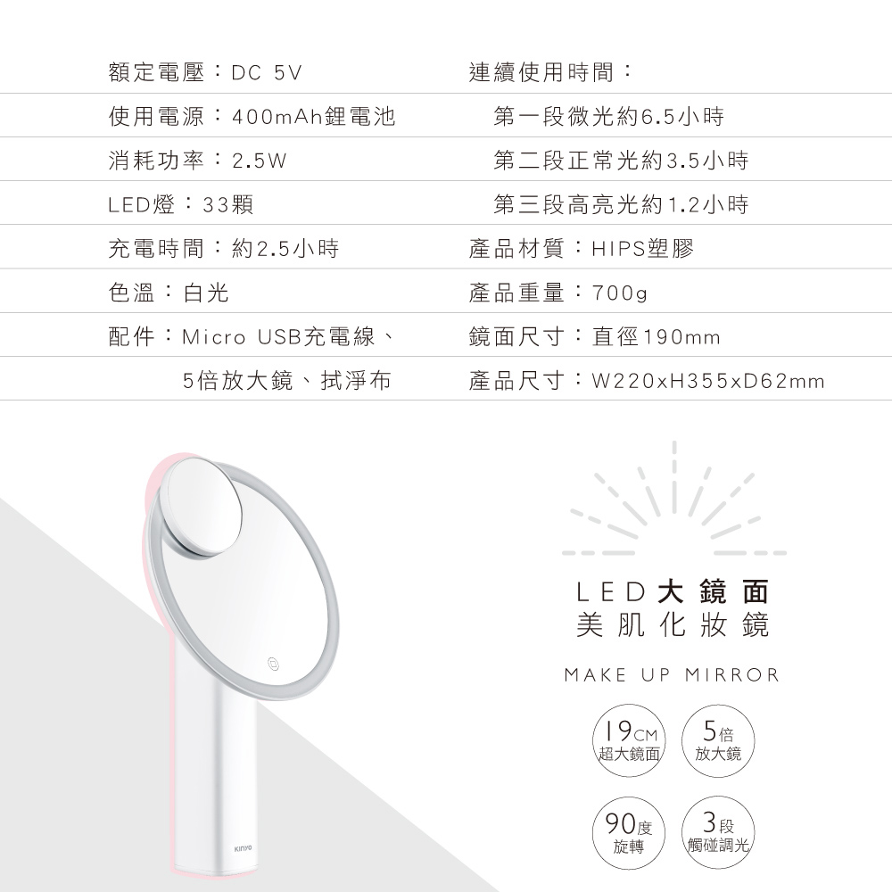 額定電壓:DC 5V 使用電源:400mAh鋰電池 消耗功率:2.5W LED燈:33顆 充電時間:約2.5小時 連續使用時間:第一段微光約6.5小時、第二段正常光約3.5小時、第三段高亮光約1.2小時 色溫:白光 產品材質:HIPS塑膠 鏡面尺寸:直徑190mm 配件:Micro USB充電線、5倍放大鏡、拭淨布 產品尺寸: W220xH355xD62 mm 產品重量: 700 g 包裝尺寸: W245xH244xD98 mm 包裝重量: 912 g 授權碼V20123101