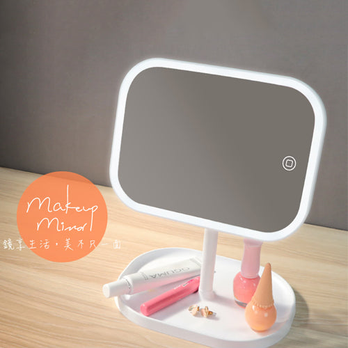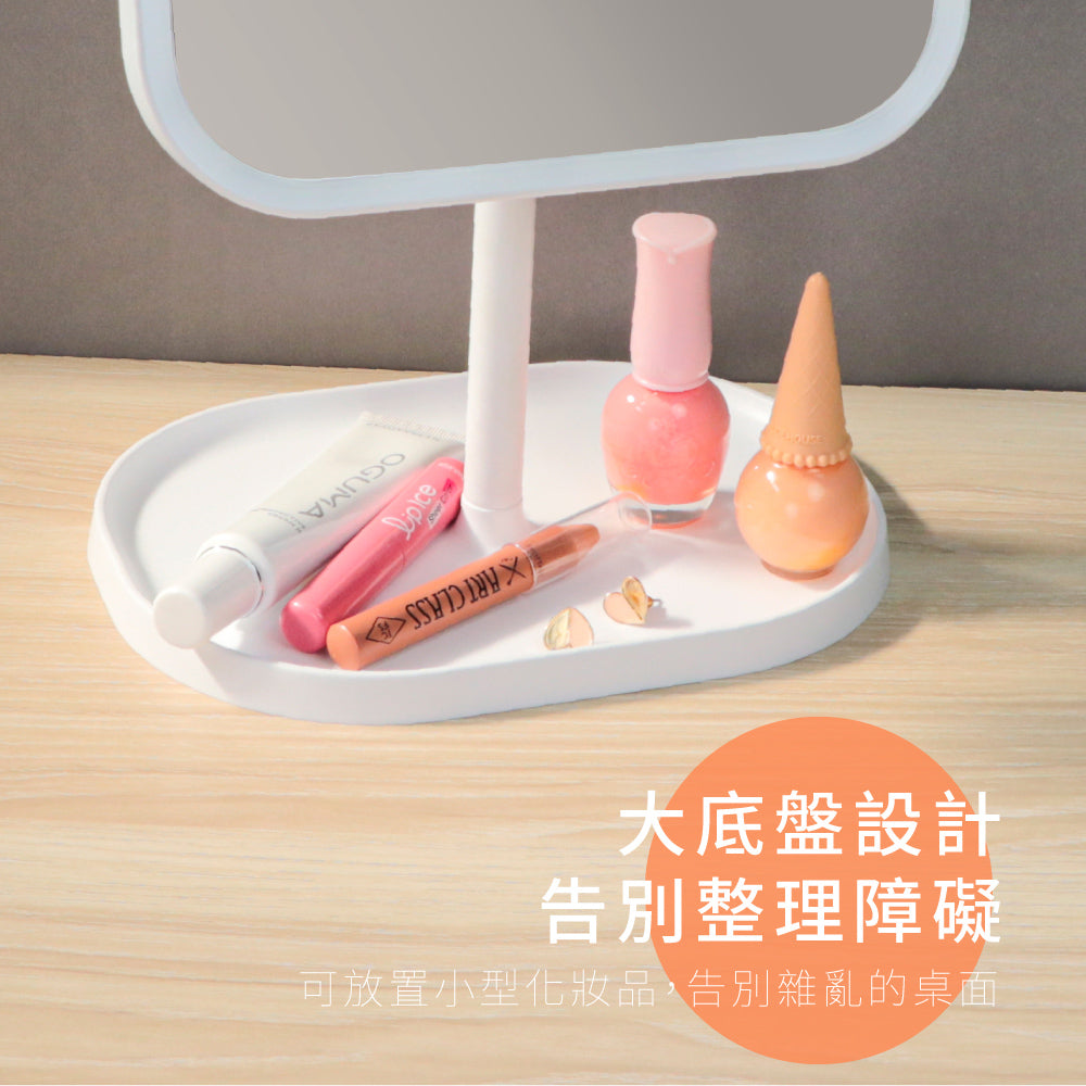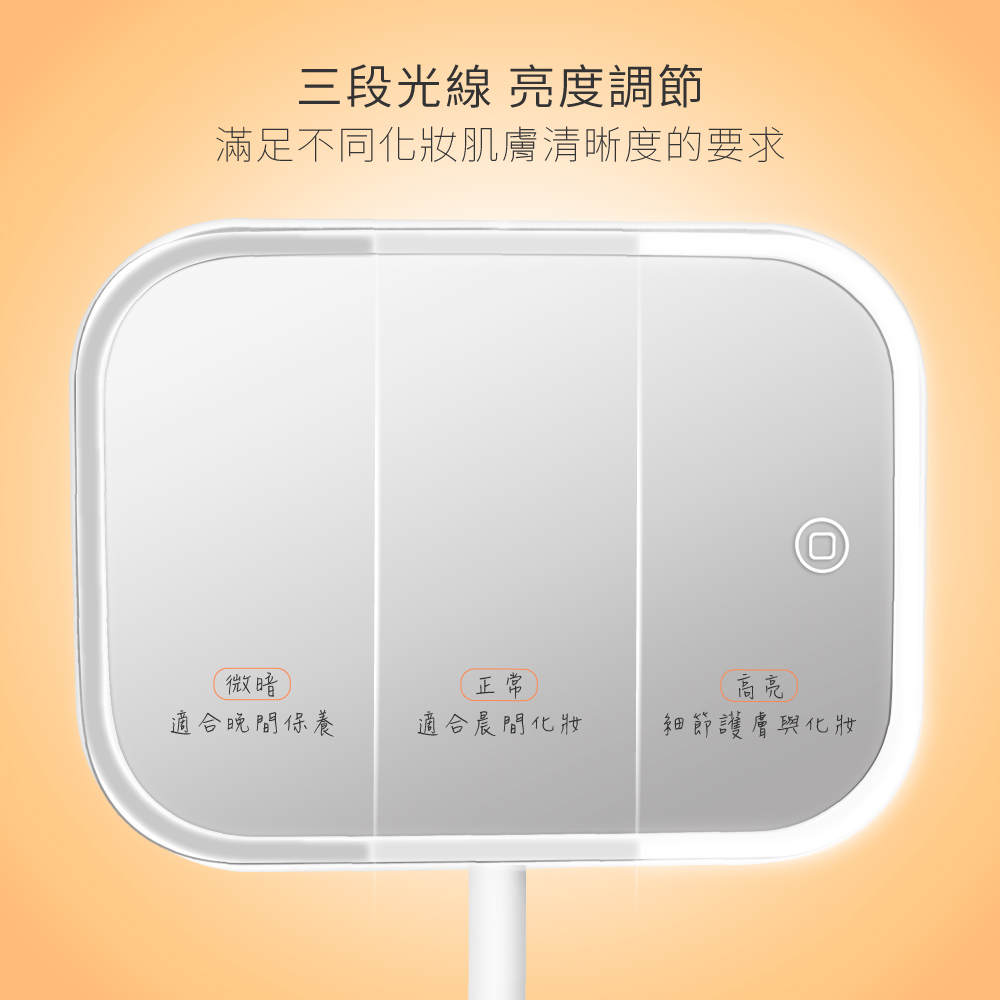 Micro USB或乾電池供電,雙電源選擇。 高密度LED燈,低耗電量,省電又環保。 模擬自然光線,柔和不刺眼,自然補光,如月光般柔和明亮。 輕觸開關即可使用,三段光線亮度調節。 加大高清鏡面,領口與鎖骨也能入鏡。 矩形底座托盤,可放置小型化妝品,告別雜亂化妝區域。 底座可拆卸設計,方便攜帶、簡單好收納。 造型簡潔時尚,百搭耐看。 鏡面可180度旋轉。