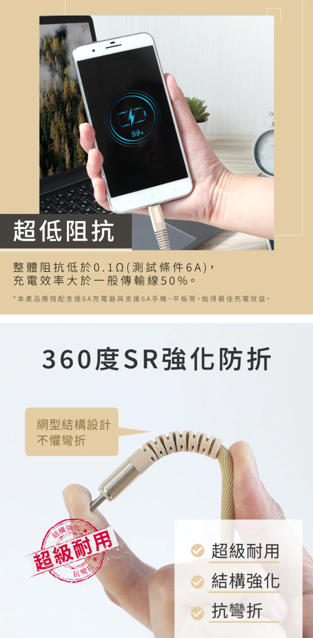 加粗6芯線,200支鍍錫純銅線,規格高於原裝數據線。 兩端插頭接觸材質,均採用加寬加厚鍍金高導銅,接觸阻 抗接近於零,大電流充電快速、安全、不發燙。 支援100W大電流供電,適用各式充電設備。 50000次以上插拔、搖擺測試,使用壽命更長。 優質鋁合金殼,陽極氧化噴砂處理,有效保護插頭端。 線尾兩端加固設計,360度均可彎折,不斷裂。 採用尼龍編織加上抗拉網絲精編織外層,不打結不纏繞, 可承受40KG不斷。 可同時充電和傳輸資料,一線搞定。 搭載E-Marker 晶片,智能控溫,安全防護。 保固說明:非人為因素之損壞,原廠保固一年。 使用前請確實遵從產品說明書內之操作指示及注意事項。 如需辦理退換貨,包裝與配件須完整(商品配件、包裝完整,無刮痕損傷)。 產地:台灣