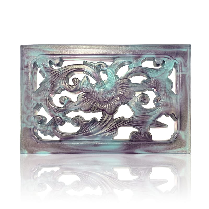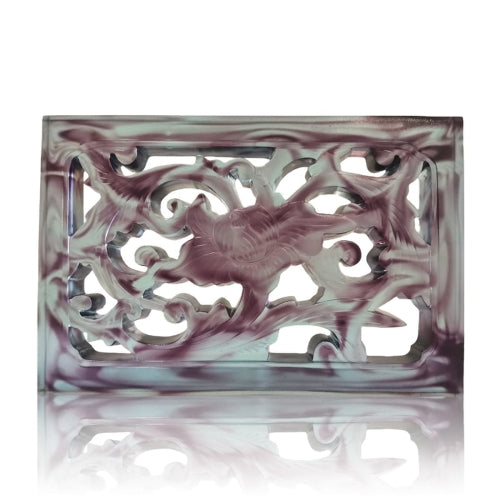 展現傳統窗花的美學,賦予其現代感。整體造型承襲古典窗花的鏤空花紋設計,以精緻的花卉與葉片圖案構成主要視覺焦點,表現出典雅的韻味。透過現代琉璃工藝,作品中的紫白色調交融,透過光線在視覺上呈現出朦朧的流動感,增加了神秘感和時尚感。