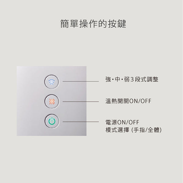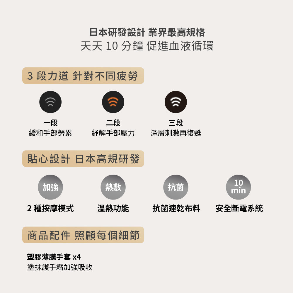● 2022年度全球限量款,日本春櫻新色 ● 升級版新增掌心指壓板,力道更進化 ● 日本獨家專利,根根手指環狀包覆細膩按壓 ● 15層立體氣囊,多點式推壓伸展 ● 2種按摩模式 X 3段按壓力道 ● 一鍵獨立溫熱功能,溫暖末梢促進血液循環 ● 獨特抗菌彈力布內裡,吸濕速乾不悶熱 ● 10分鐘自動斷電設計,台灣電檢局安全認證 ● 附贈4個塑膠手套,塗抹護手霜吸收更好