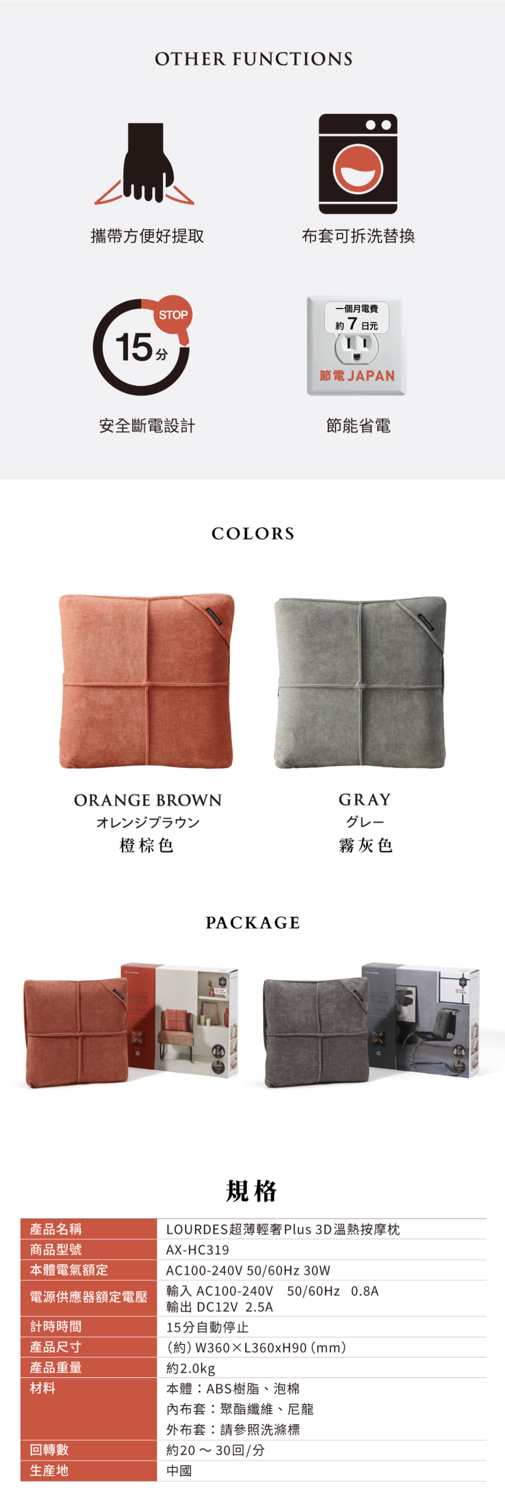 本體電氣額定:AC100-240V 50/60Hz 30W 電源供應器額定電壓: 輸入 AC100-240V 50/60Hz 0.8A 輸出 DC12V 2.5A 計時時間:15分自動停止 產品尺寸:(約) W360 X L360xH90 (mm) 產品重量:約2.0kg 材料: 本體:ABS樹脂、泡棉 內布套:聚酯纖維、尼龍 外布套:請參照洗滌標 回轉數:約20~30回/分 產地:中國