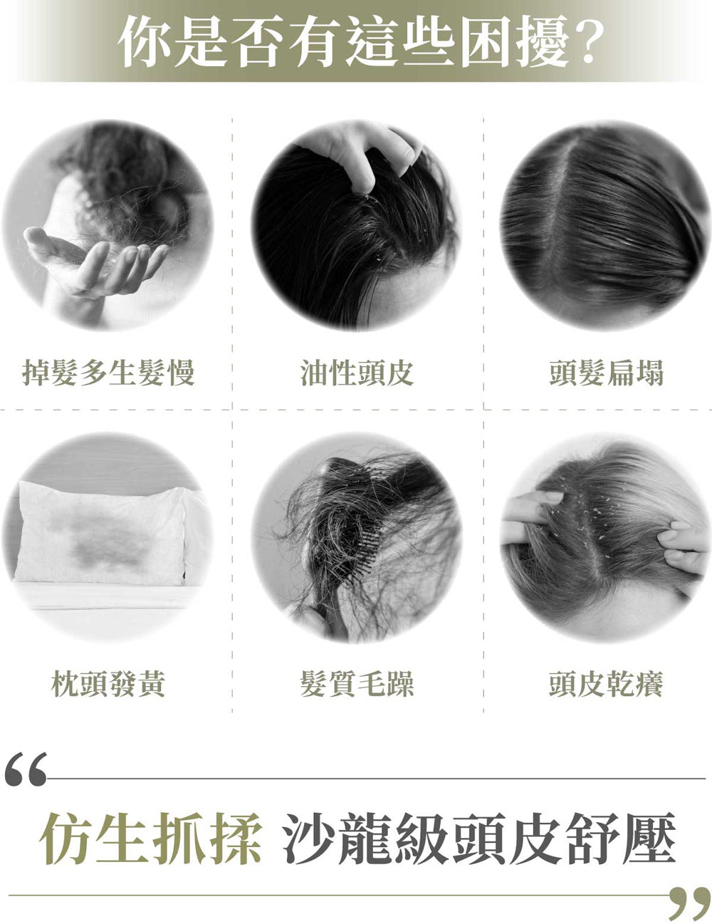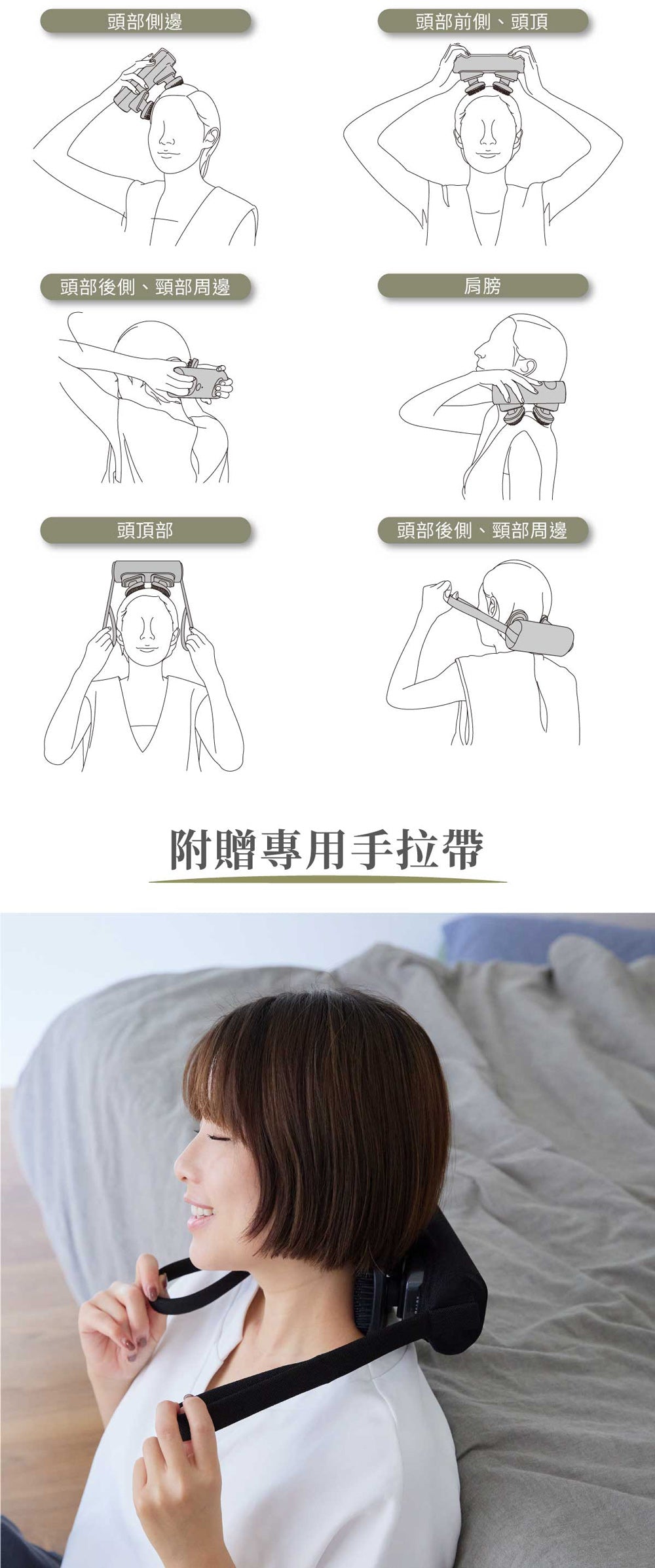 商品特色 沙龍級頭皮壓力管理師,仿生抓揉提放手感 一鍵操作|可拆卸清洗,養頭皮護髮不費力 一機二用|一台包辦按摩頭皮、肩頸,專用手拉帶方便施力 擬真手感|仿生手揉提放,動態擬真螺旋抓捏 V型貼合設計|有效抓取抬揉,按摩力度更深層有感 2種按摩頭|軟爪頭溫和放鬆頭皮;硬爪頭強度刺激按摩減壓 3段模式|專業揉捏、緩和按壓、高速按摩,自由選擇切換 乾濕兩用|全機IPX7防水等級,邊沐浴邊享受紓壓極致體驗 超長續航|充飽電可使用1.5小時 安全認證|通過國際IEC及台灣BSMI合格雙認證,品質有保障 自動斷電|5分鐘自動斷電安全設計 銷售重點 日本上班族最愛,每天 5 分鐘,頭頸兩用紓壓按摩器-你專屬的沙龍級頭皮壓力管理師!日本體大實驗室實測有效降低壓力,自律神經量測證實受測者達到顯著放鬆狀態,舒緩頭皮緊張,增加頸後血液循環,減輕肩頸緊繃壓力。
