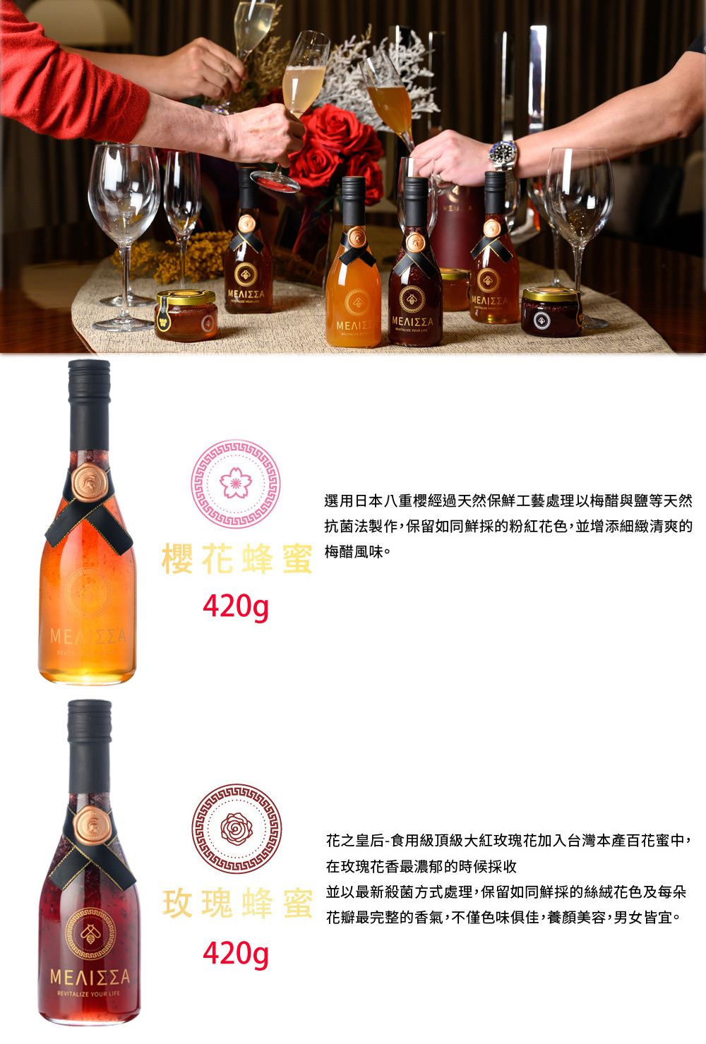 在台灣秘境的木質龍眼蜜中,加入嬌貴的日本八重櫻並經過專業職人醃漬及殺菌淨化後