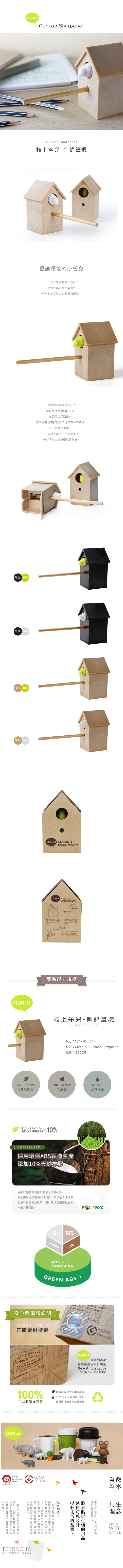 愛護環境的小雀兒 小小雀兒是森林的守護者,他每天都守在鳥巢裡,時時刻刻提醒大家要愛護環境! 當你的鉛筆寫到鈍了,準備放進鳥巢洞口削筆,雀兒馬上探頭出來,質問你有沒有好好愛惜這支森林的孩子! 將小屋放在書桌上,形成讓人玩味的可愛場景,也叮嚀你大自然環境的美好。