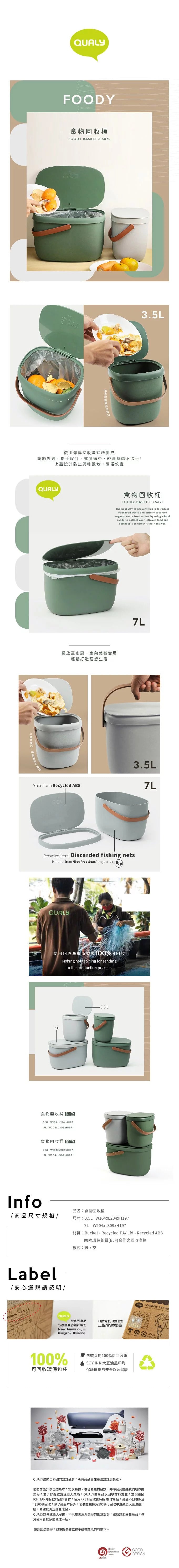 品名:QUALY 食物回收桶3.5L 尺寸:W164xL204xH197mm 容量:3.5L 材質: Bucket - Recycled PA/ Lid - Recycled ABS 顏色:綠/灰