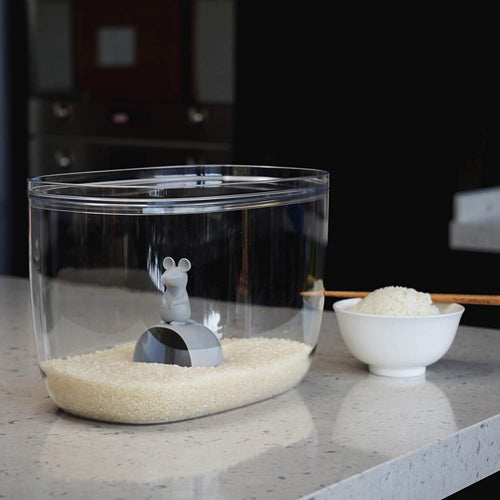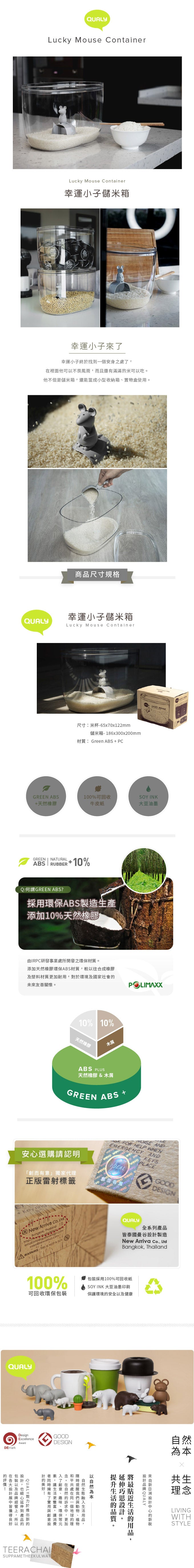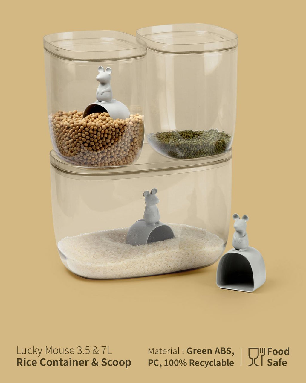 幸運小子來了 幸運小子終於找到一個安身之處了,在裡面他可以不畏風雨,而且還有滿滿的米可以吃。 他不但是儲米箱,還能當成小型收納箱、置物盒使用。 ※儲米箱容量:7L,可裝6kg的米。 ※米杯容量:180ml,一杯可裝150g的米,共有四個刻度(1cup、3/4、1/2、1/4)。