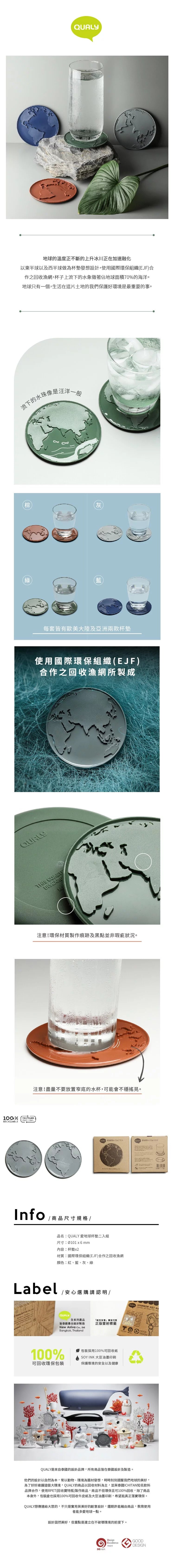 品名:QUALY|愛地球杯墊二入組 尺寸:Ø101 x 6 mm 內容:杯墊 x 2 材質:國際環保組織(EJF)合作之回收漁網 其他說明 顏色略有偏差,以實品顏色為準。 More information: The color of real products will be slightly different form the website through your monitor. 產地/製造方式 泰國
