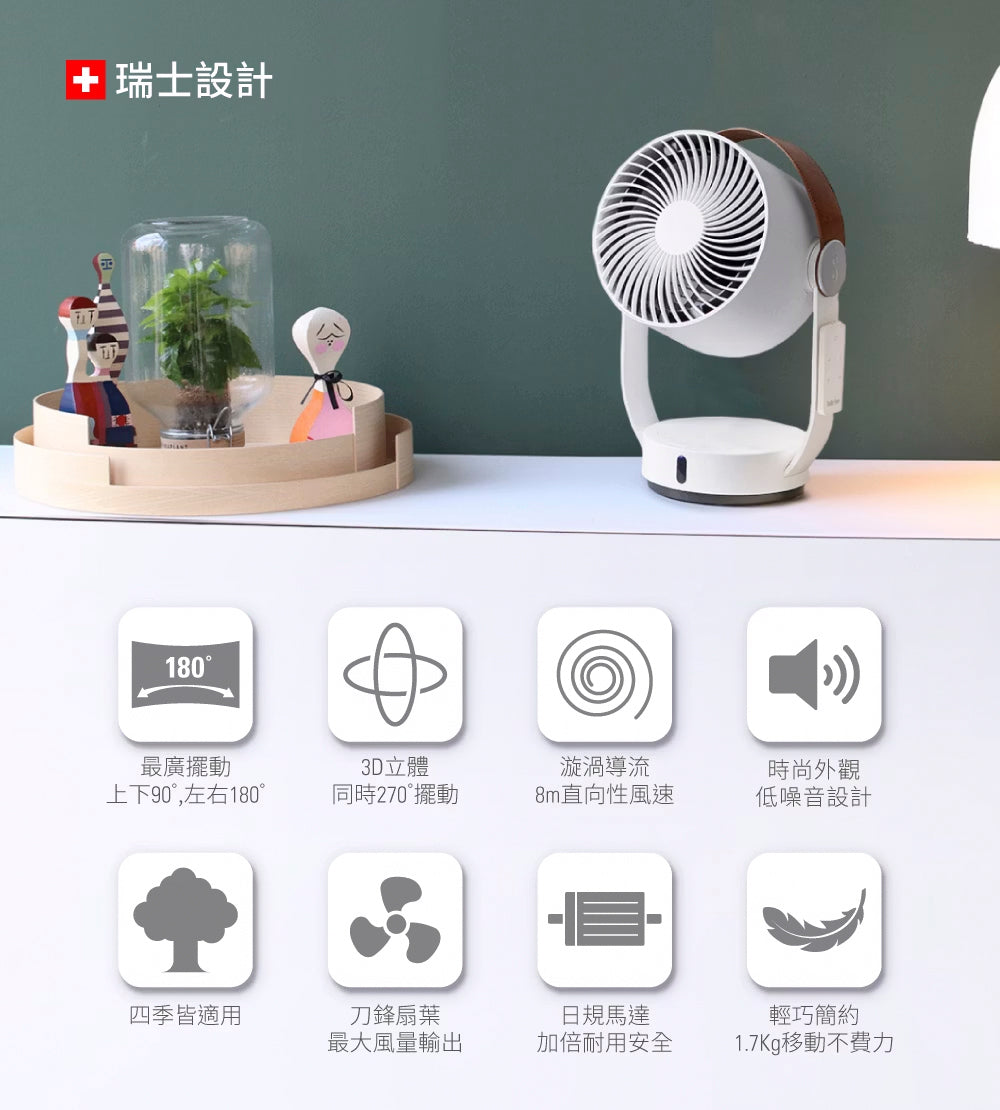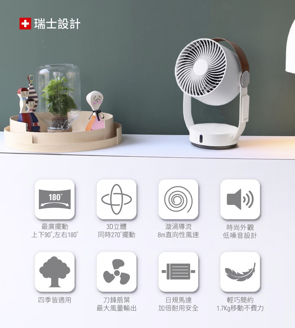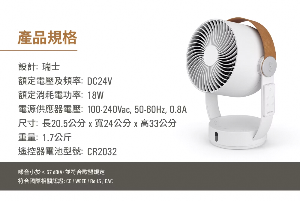 ■ 一年四季均衡室溫 ■ 3D上下同時擺動 ■ 直向性風柱 ■ 日規馬達 節能省電 產品規格 設計:瑞士 額定電壓及頻率:DC24V 額定消耗電功率:18W 電源供應器電壓:100-240Vac, 50-60Hz, 0.8A 尺寸:長20.5公分x寬24公分×高33公分 重量:1.7公斤 噪音小於<57dB(A)並符合歐盟規定 符合國際相關認證:CE/WEEE/ROHS/EAC