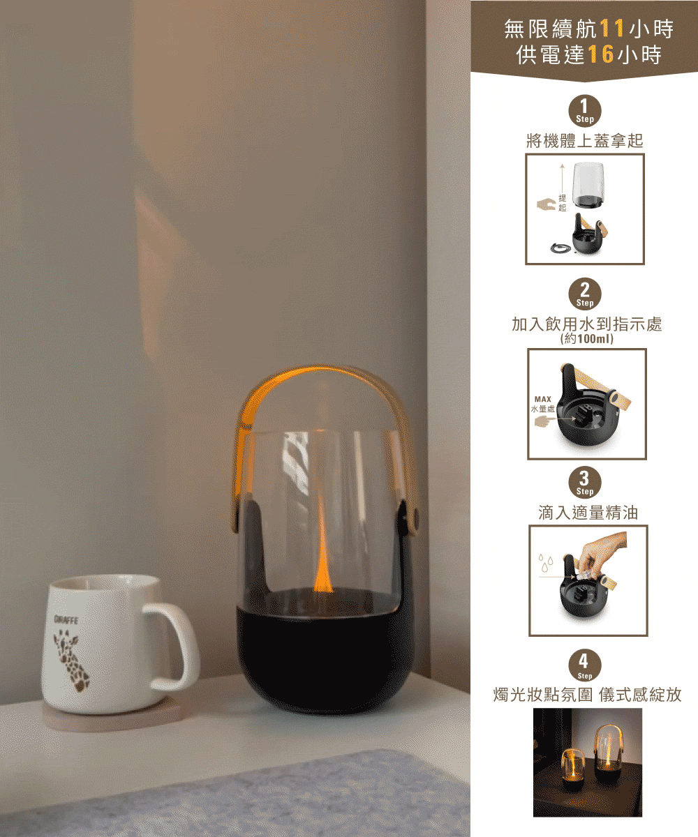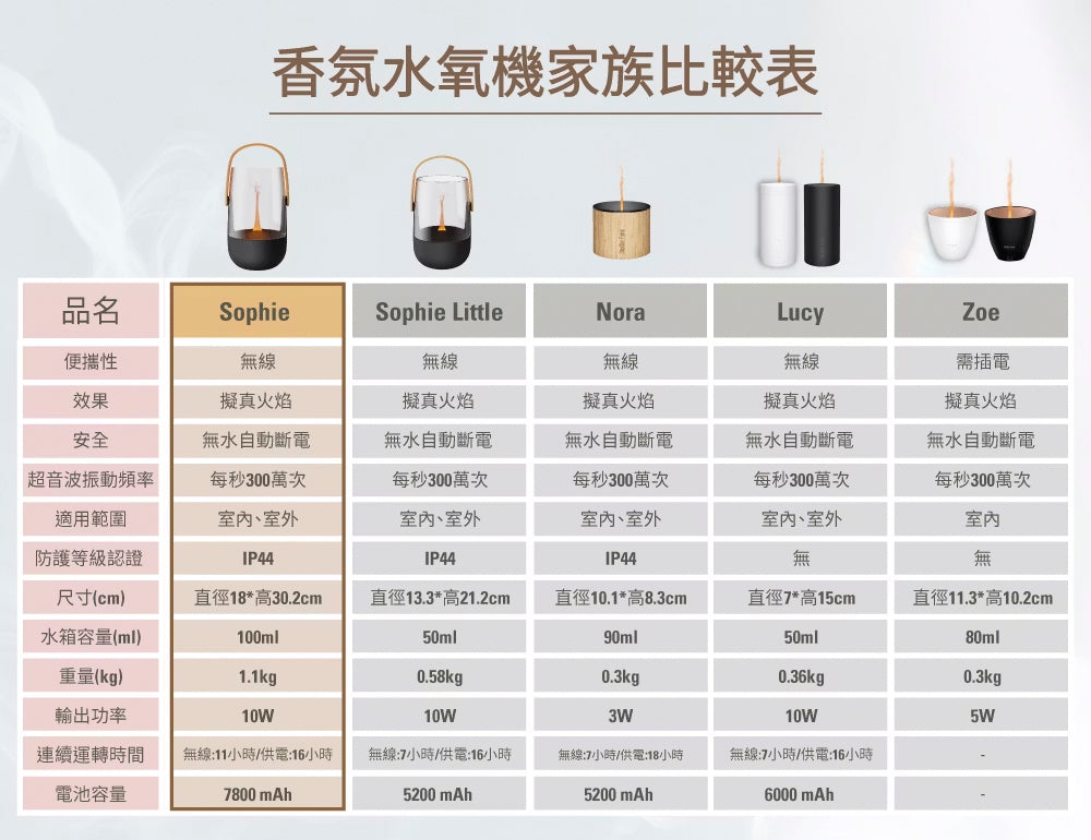 ■ 超細負離子水霧 包覆精油分子迅速擴香 ■ IP44 防濺水設計 ■ 小於26分貝 舒適安眠 ■ 三段調光 營造浪漫情調 ■ 無線續行11小時/ 供電模式16小時(內建5200mAh鋰電池) ■ 安全守護 無水自動斷電 ■ 露營旅宿好夥伴