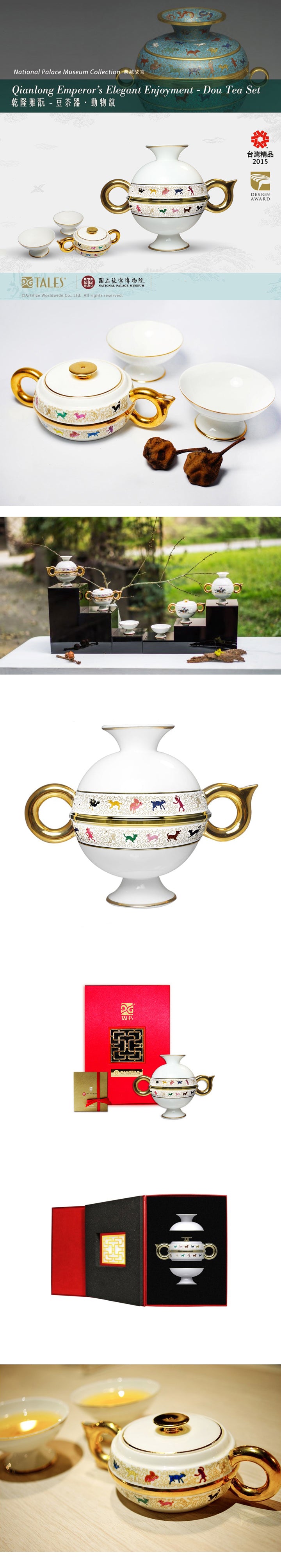 豆,中國古代盛食器皿,後亦作為禮器。此茶器外觀造型源自於「豆」(象形字,上面一橫為蓋子、口為承裝食物的器皿、兩點及下面一橫則為腳),將故宮藏品「清代掐絲琺瑯動物紋豆」原有的雙耳轉化為壺把及壺嘴,加上創意設計解構成一壺二杯或一壺一杯一茶托,上下為杯中間為壺,兼具陳設美感及實用功能。壺身紋飾設計引用「清代掐絲琺瑯動物紋豆」的圖案造型加以現代時尚化,以掐絲卷鬚紋為錦,間飾各種動物,居家香茗,品味逸趣,古韻丰采,與眾不同。器身邊緣線條以24K純金手工描繪,骨瓷材質體薄透光,造型設計獨特,是為專利商品。